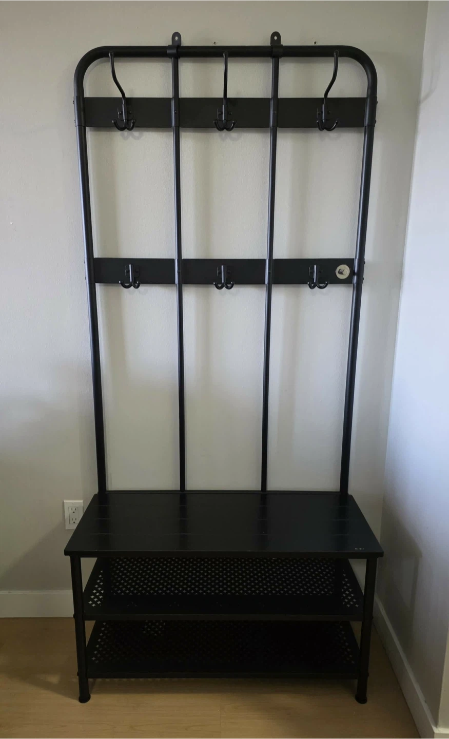 Selling a black IKEA Hemnes hallway bench with a coat rack. It's in great shape and perfect for organizing your entryway! It features a bench with two shelves for shoes or storage and a coat rack with hooks for hanging coats and bags!