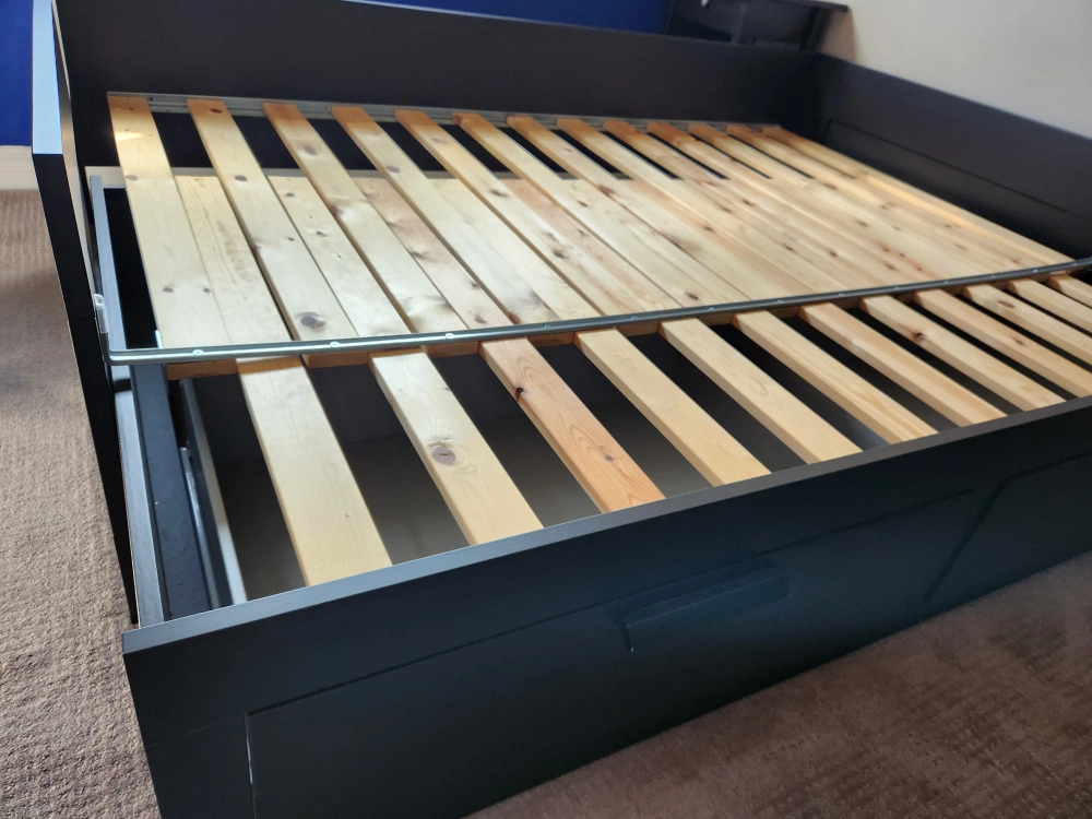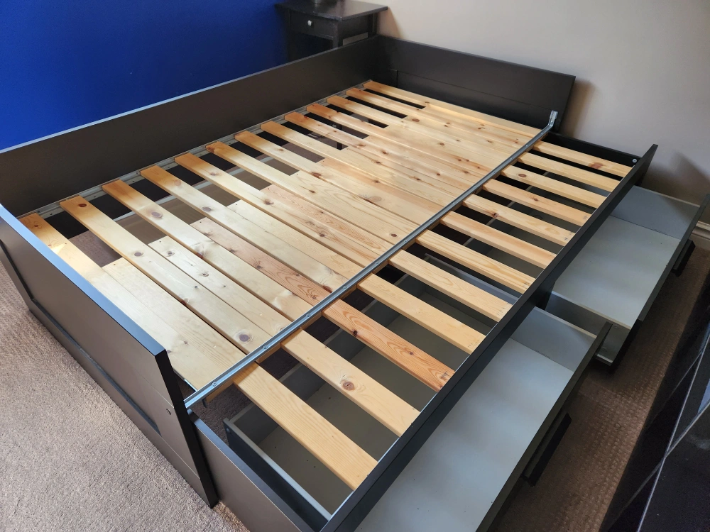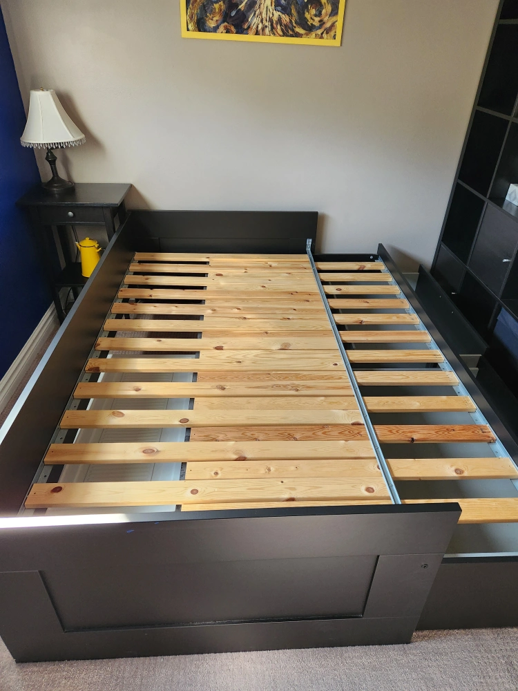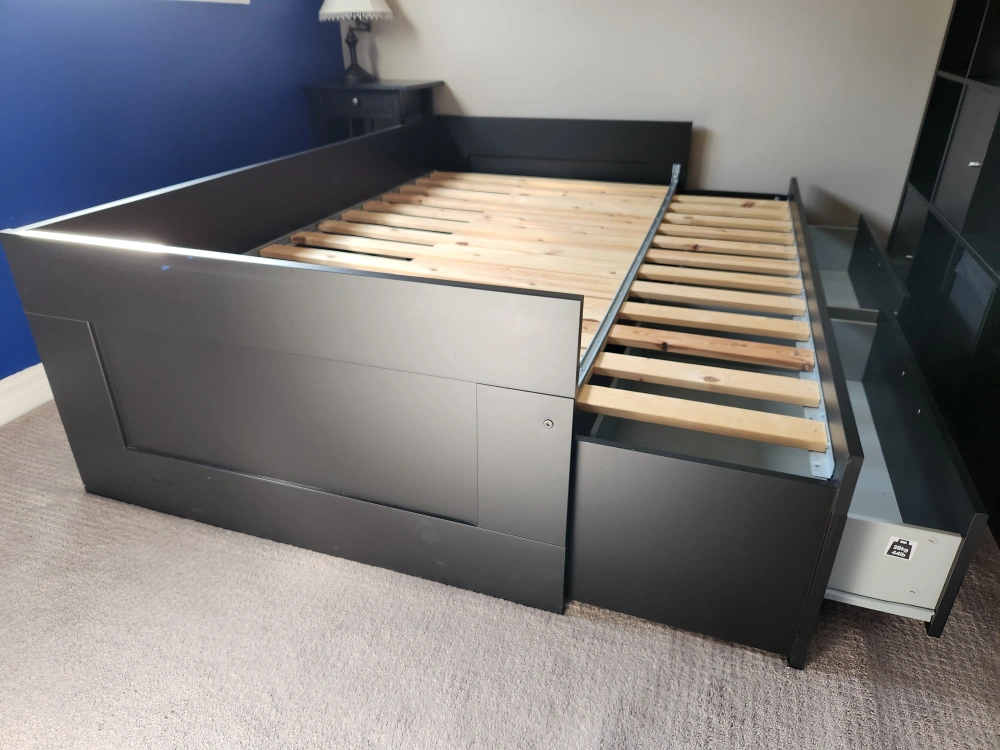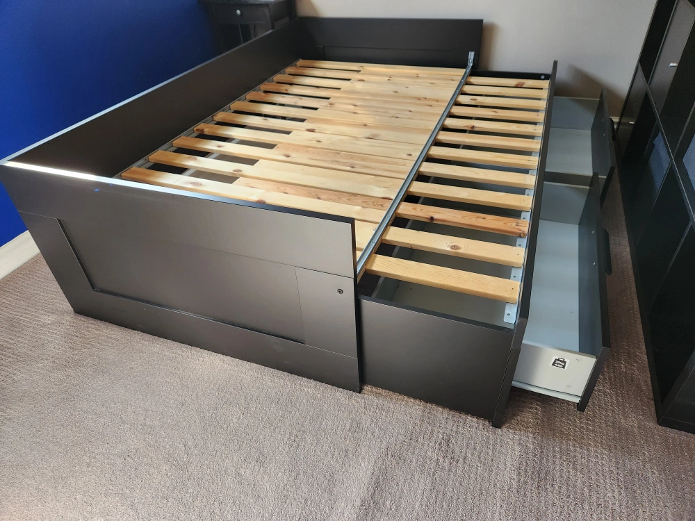 Selling an IKEA Hemnes daybed frame in excellent condition! It features a sleek design with two spacious drawers. The daybed expands from a twin to a king sized frame making it super versatile! Queen size mattress also available for an extra $75.
