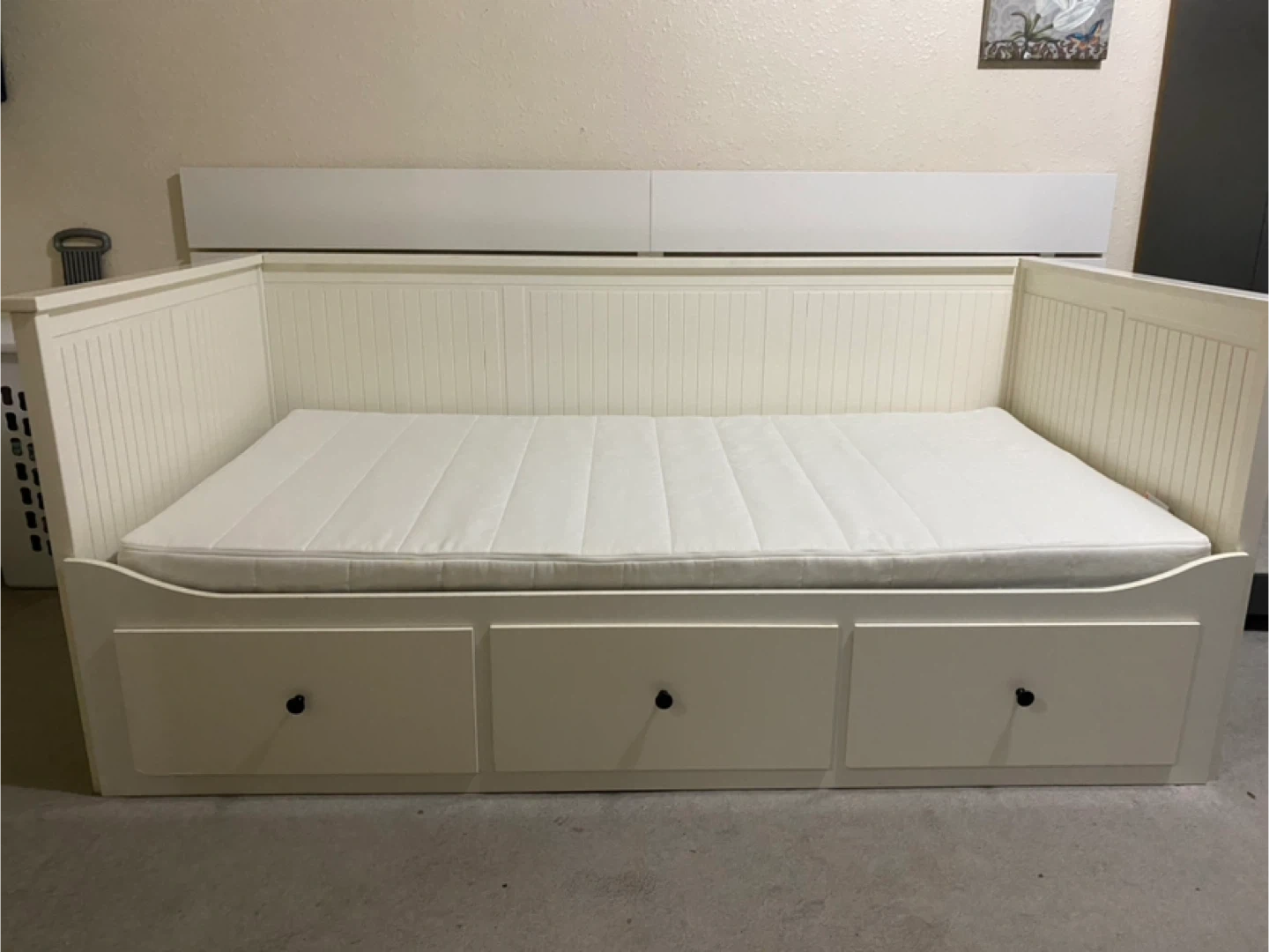 Selling an IKEA Hemnes daybed frame with three drawers perfect for a guest room or a kid's room. One Ikea twin mattress Assembly instructions included!pick up near surrey centre station or can deliver and assemble for extra.smoke and pet free.