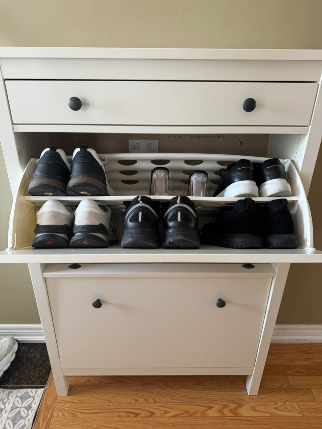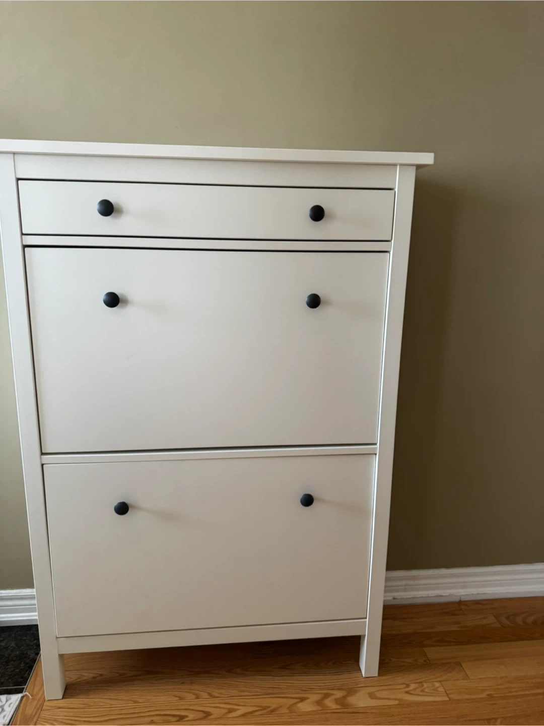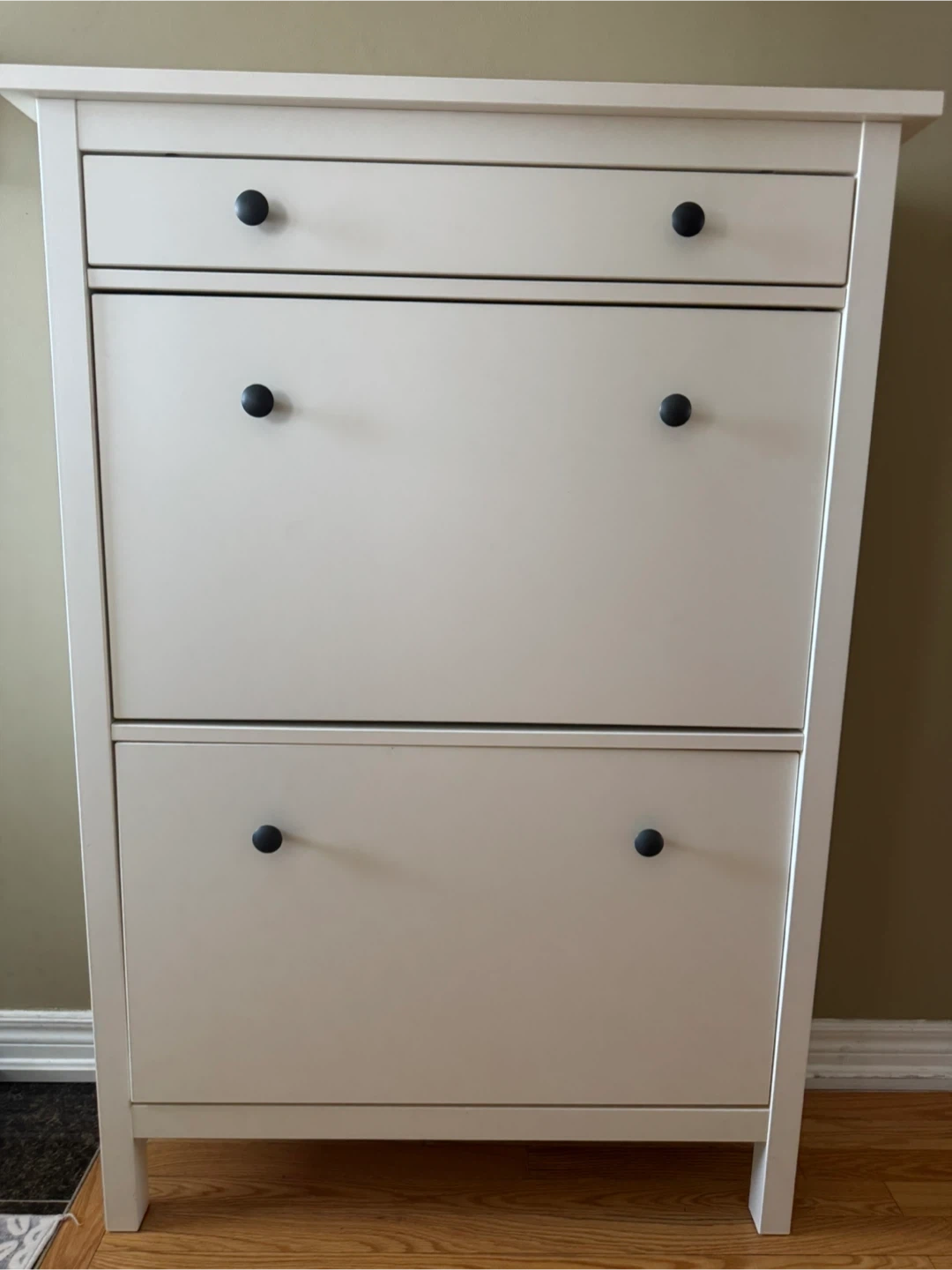 Selling an Ikea Hemnes shoe cabinet in white. It's in great condition and perfect for keeping your entryway organized. This cabinet helps you maximize space while keeping your shoes neatly stored away