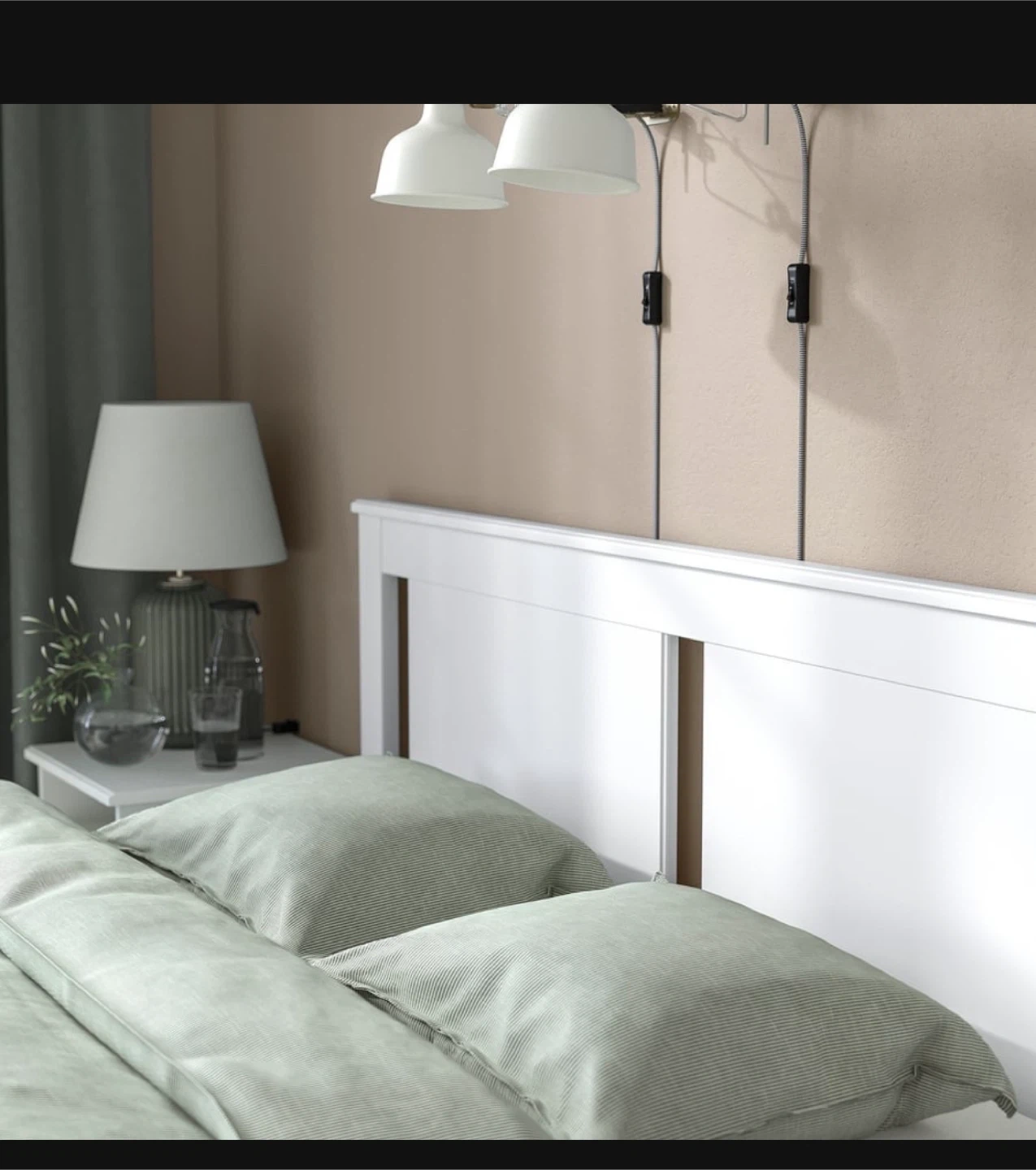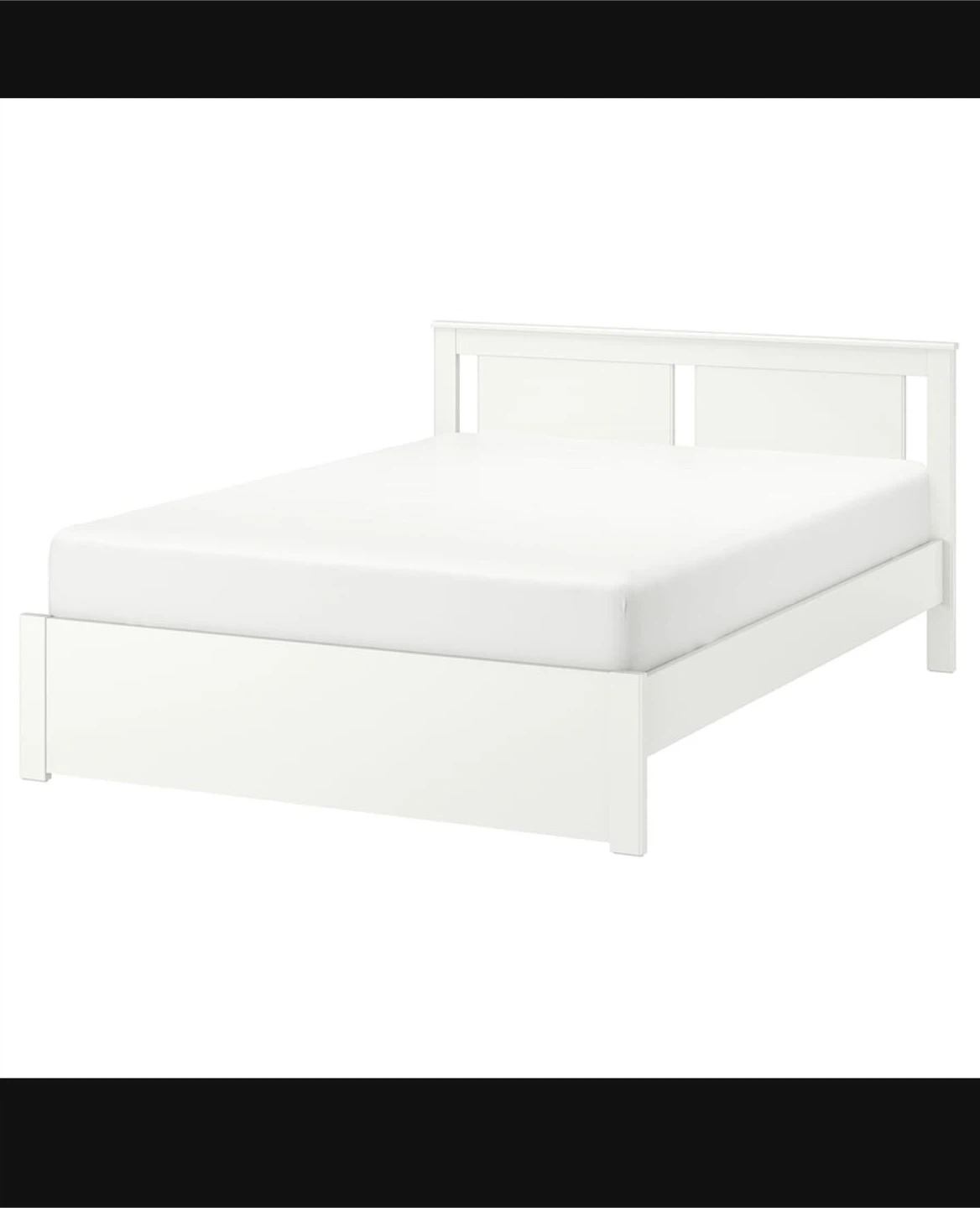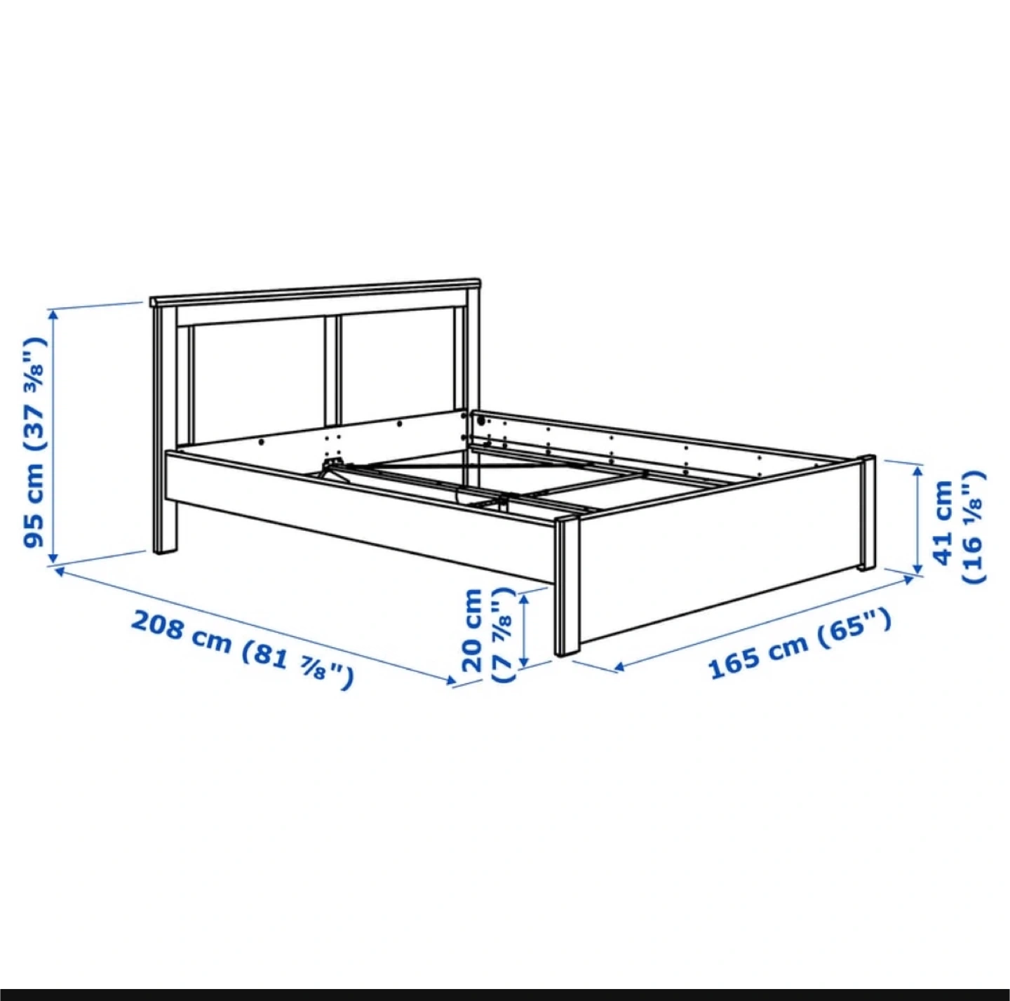 Selling a white IKEA Hemnes bed frame. It's in great shape and ready for a new home! The dimensions are approximately 208 cm (81 7/8") in length and 165 cm (65") in width. The headboard stands at 95 cm (37 3/8") tall, and the side height is 41 cm (16 1/8").