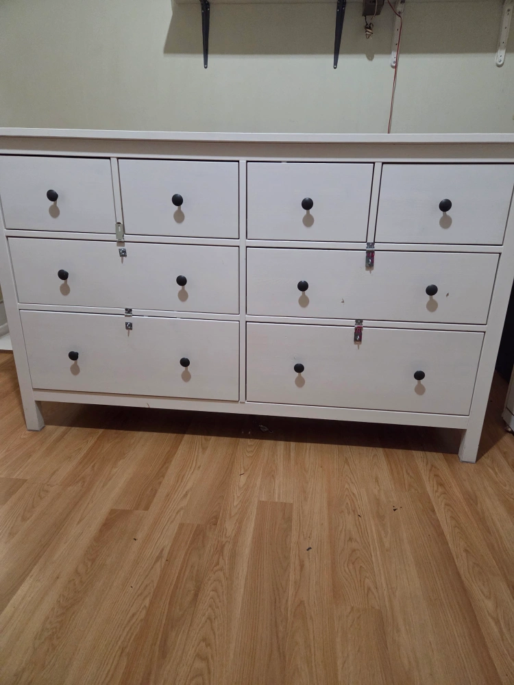 Selling a white IKEA Hemnes dresser. It features a classic design with multiple drawers, perfect for organizing your clothes and keeping your room tidy. The dresser is in great condition and ready for a new home!