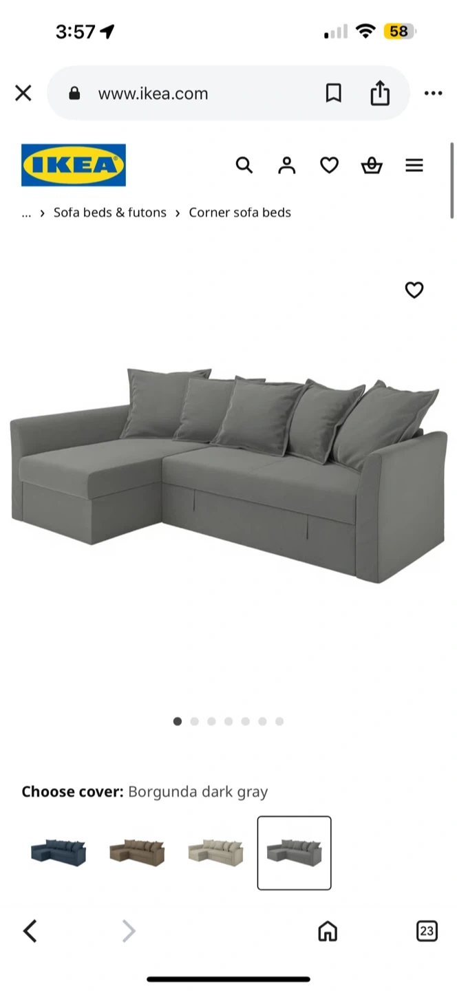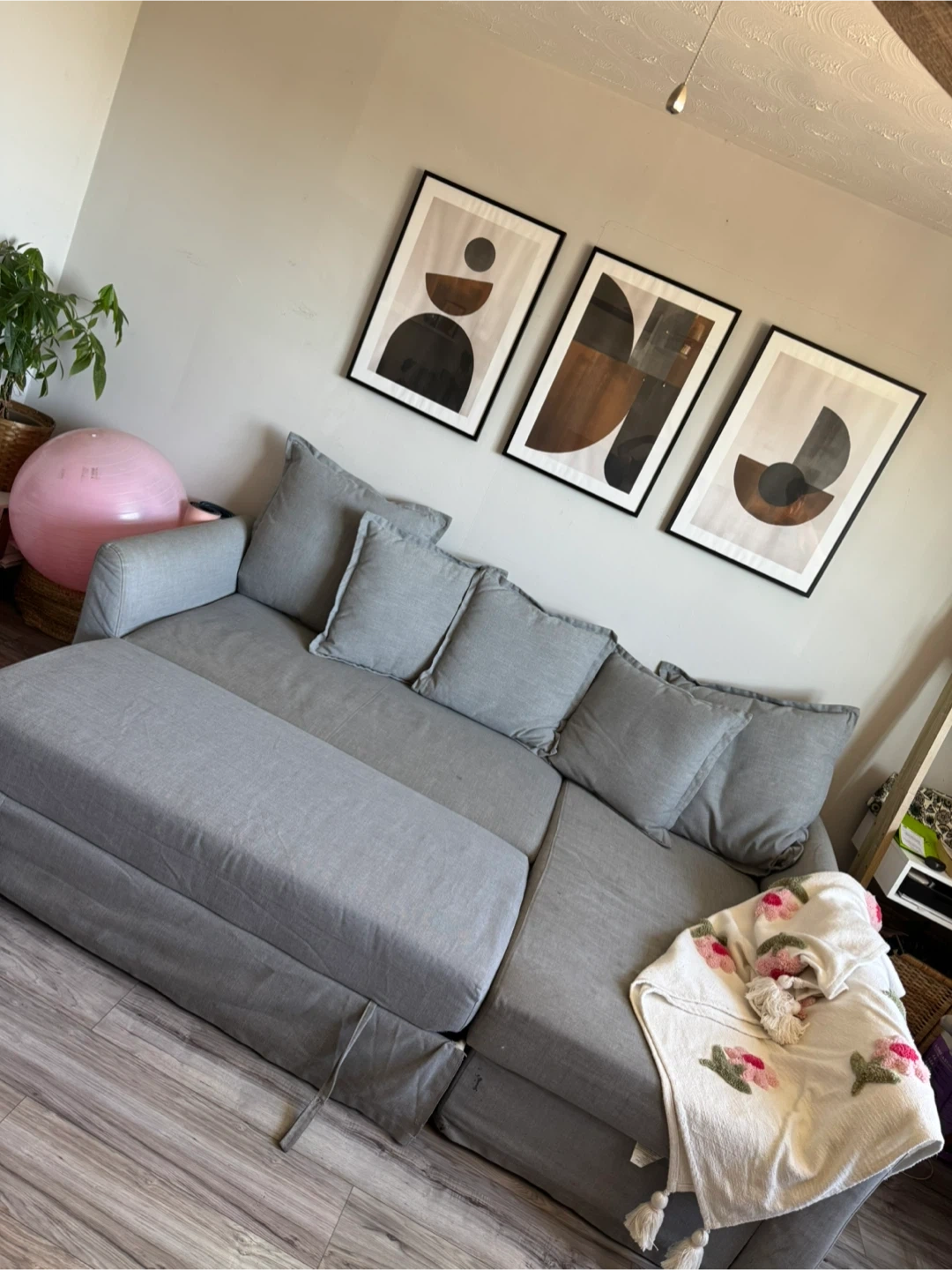 Selling an IKEA HOLMSUND corner sofa-bed in Borgunda dark gray! It's in great shape and super functional. This sofa easily converts into a bed, perfect for guests or small spaces. The dimensions are approximately 230 cm x 151 cm, and it's really comfortable for lounging or sleeping!