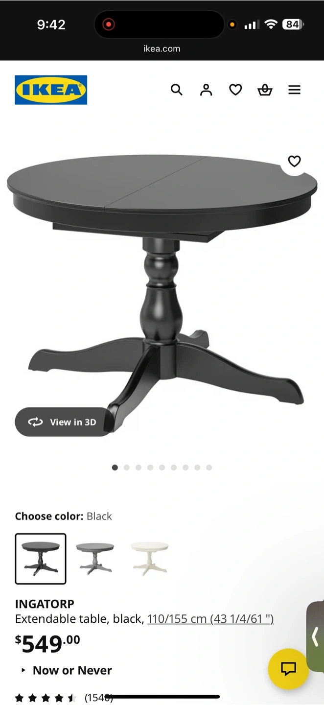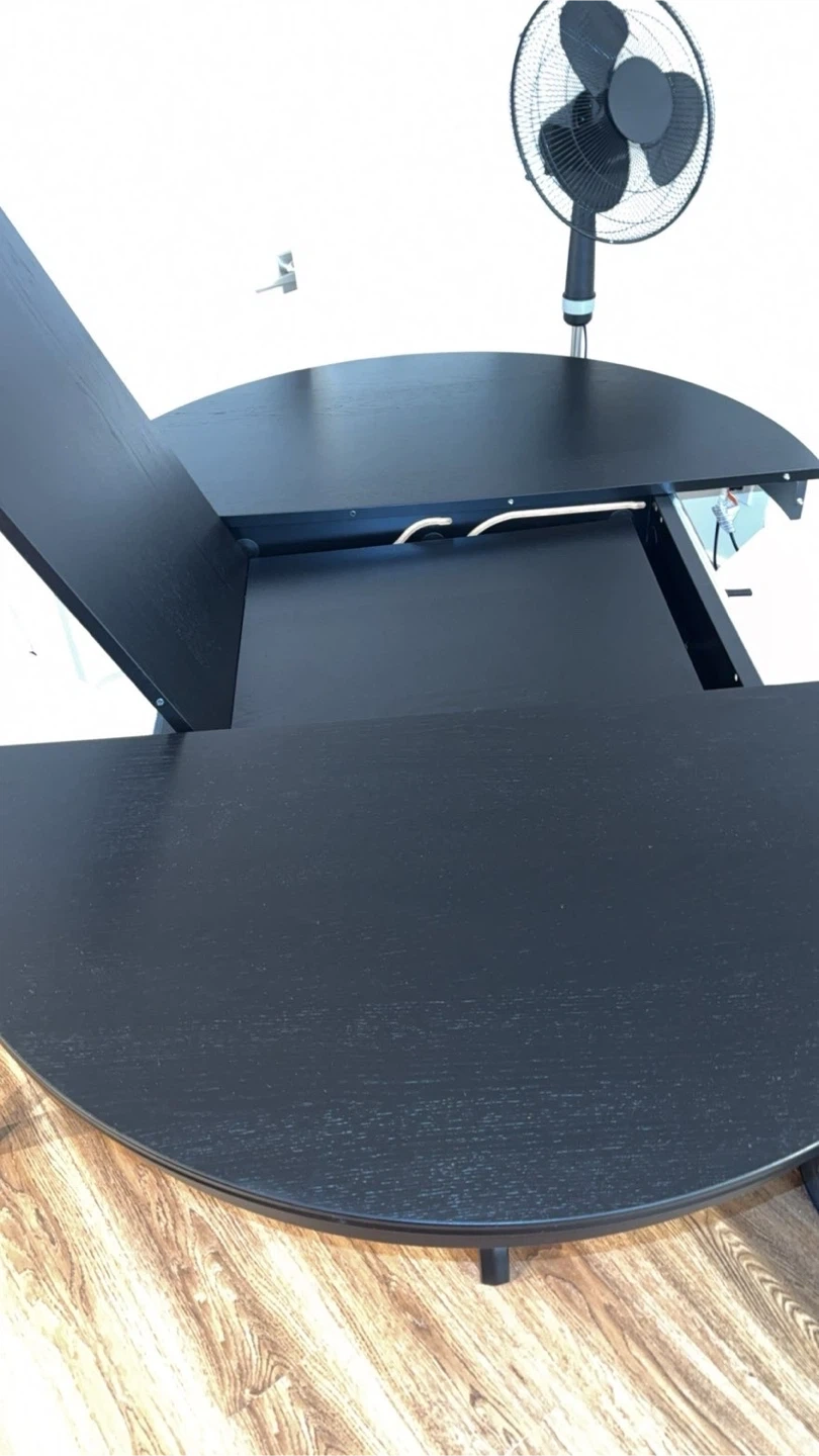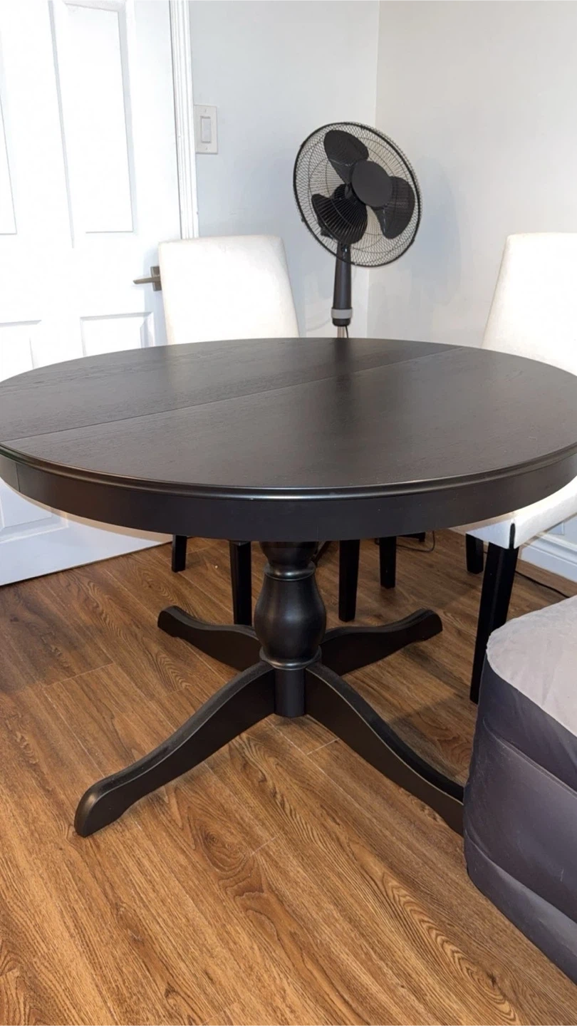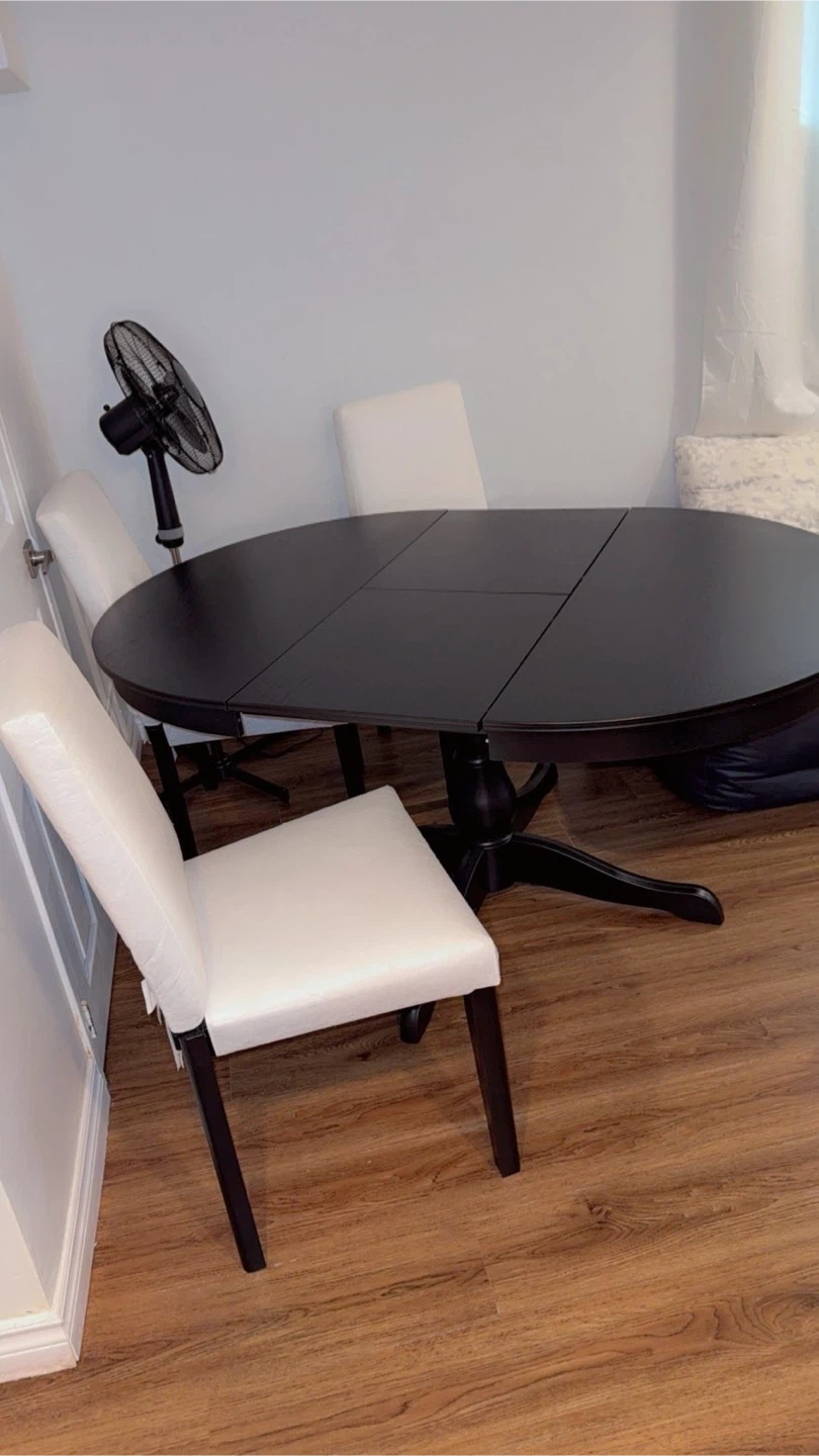 Selling an IKEA INGATORP extendable table in black, along with a BERGMUND chair. The table extends to 110/155 cm (43 1/4/61 "). Originally bought for , it's a great addition to any dining space. Plus 3 chairs.