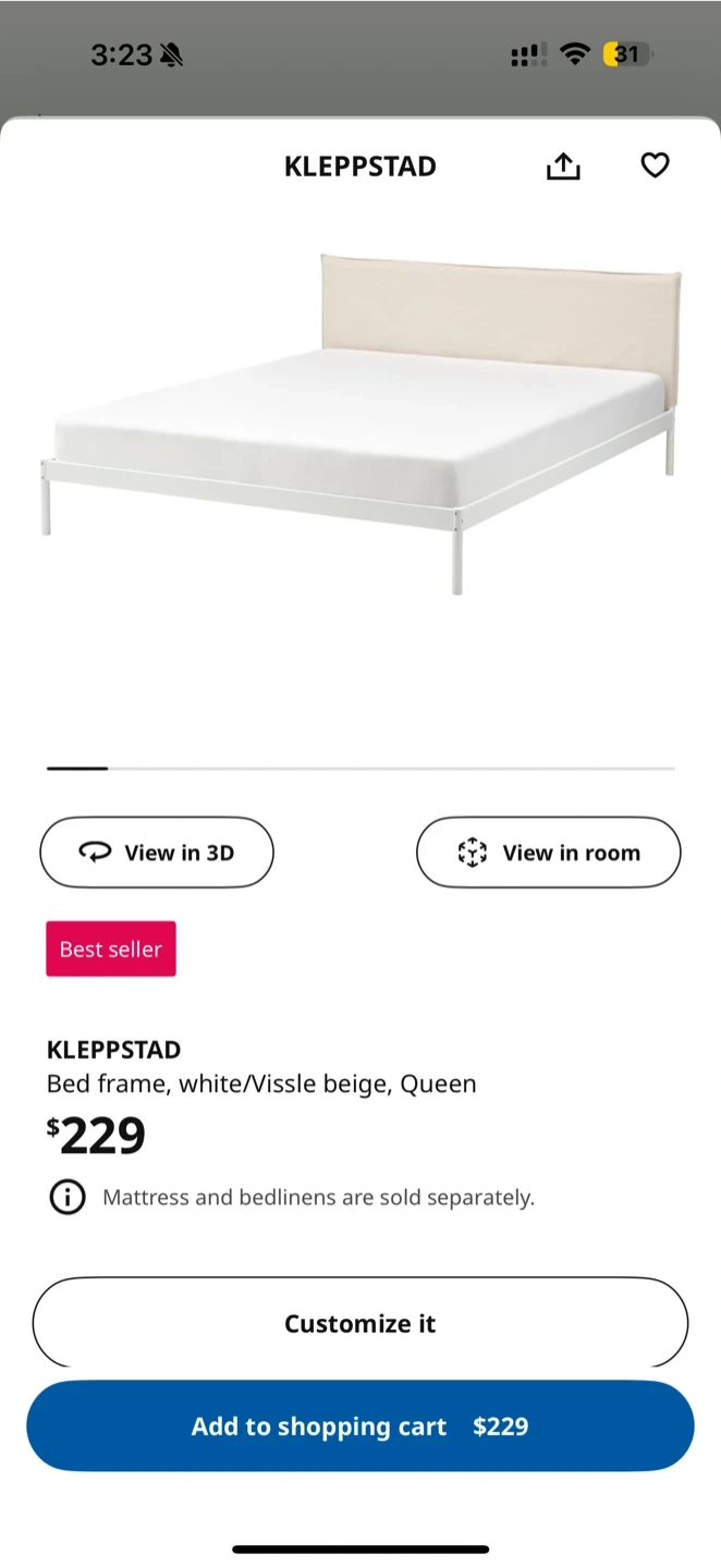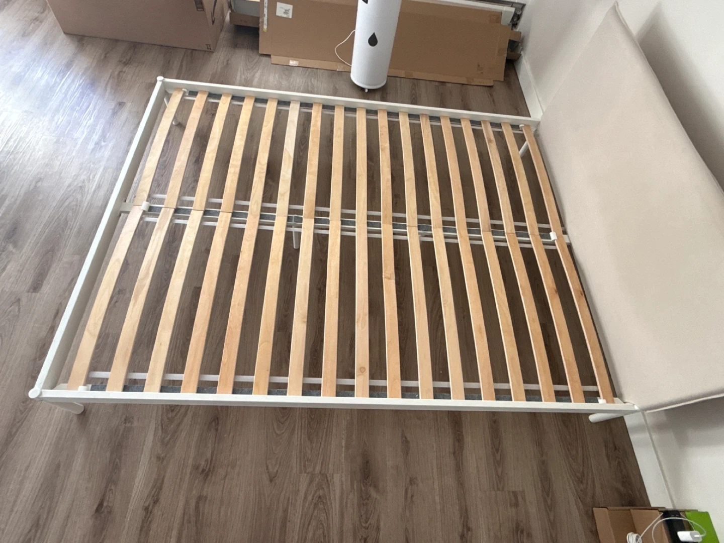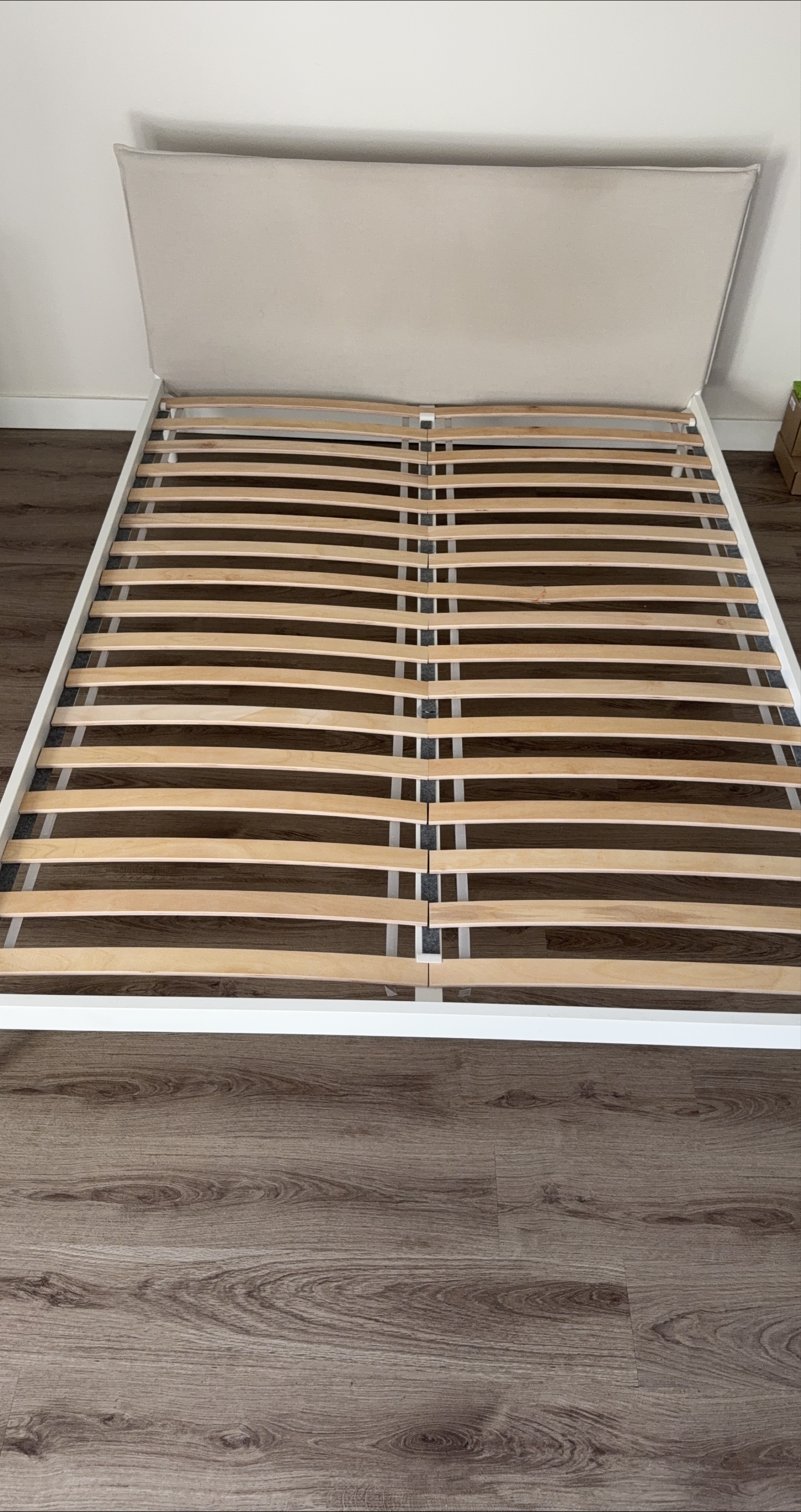 Selling a almost new IKEA bed frame with a headboard. It's in great condition and ready for a new home! The frame is white and the headboard is a light neutral colour. It's sturdy and easy to assemble. Perfect for any bedroom! - Relocation sale