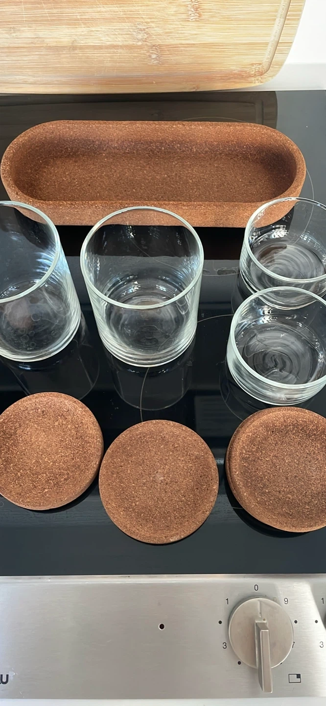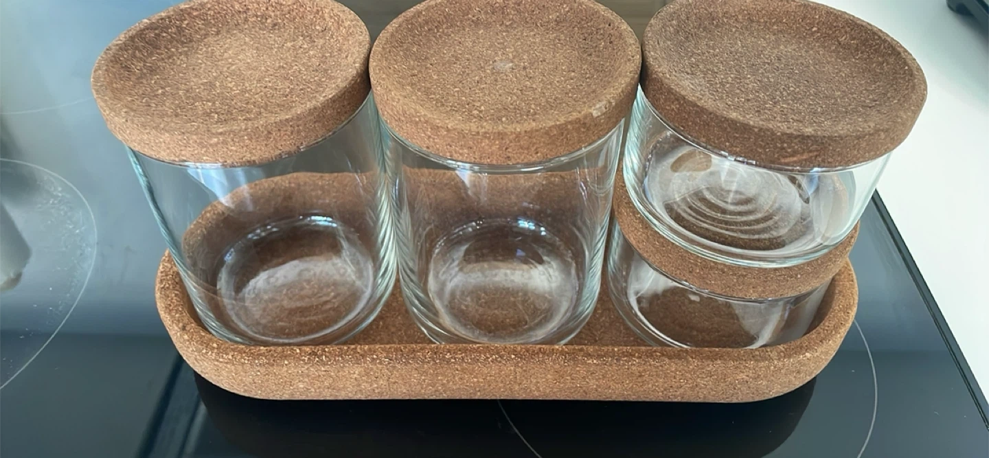 Selling a set of IKEA Korken jars with cork lids, complete with the matching tray. Perfect for organizing your kitchen or pantry! They're in great condition and ready for a new home
