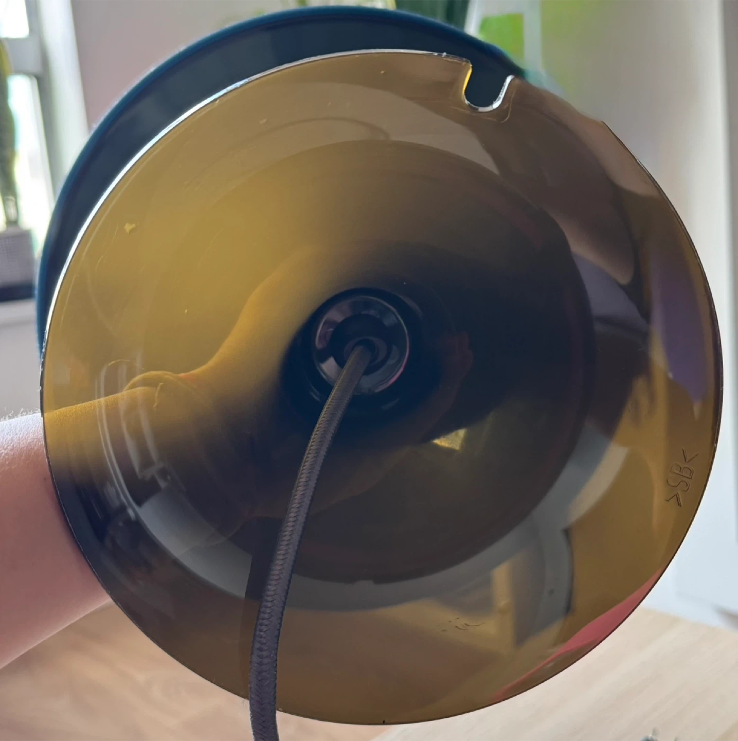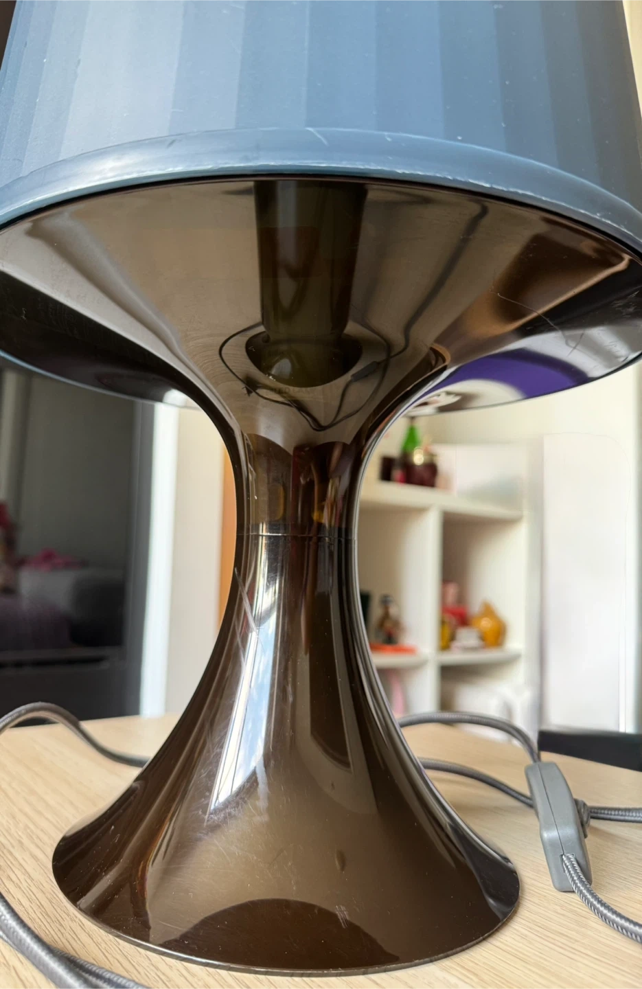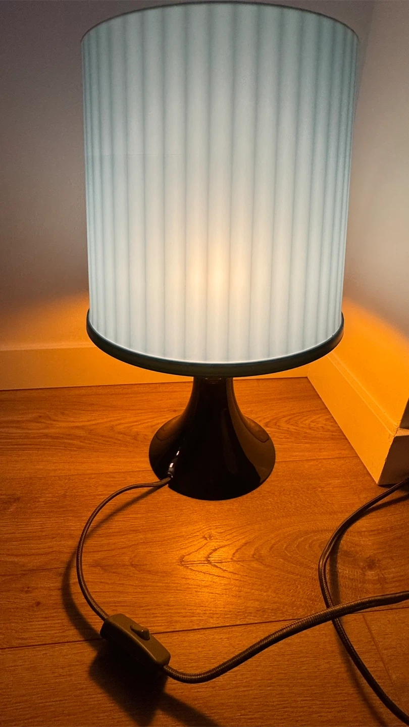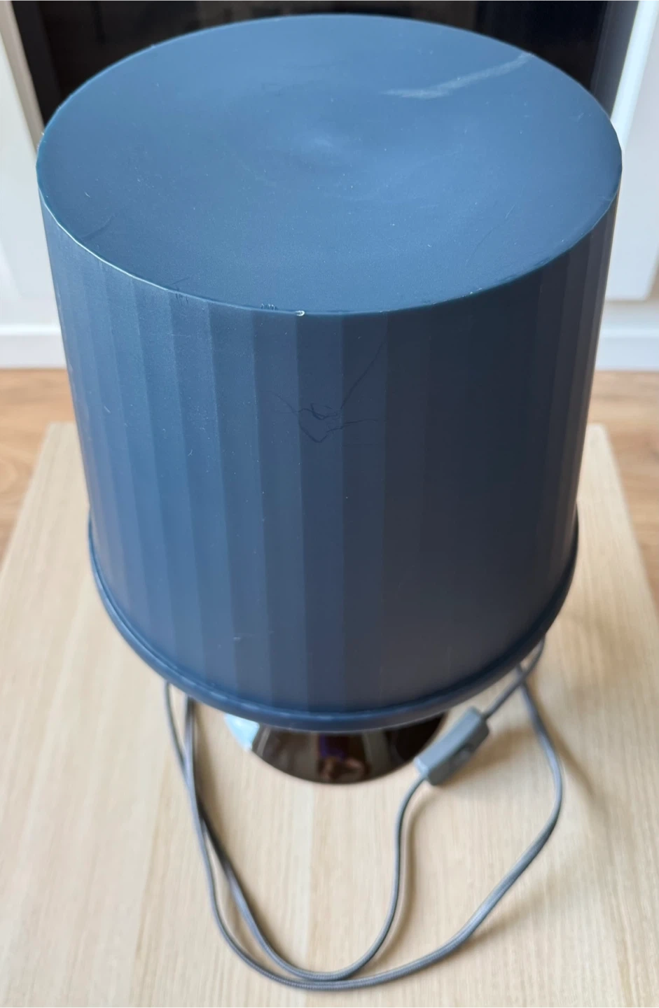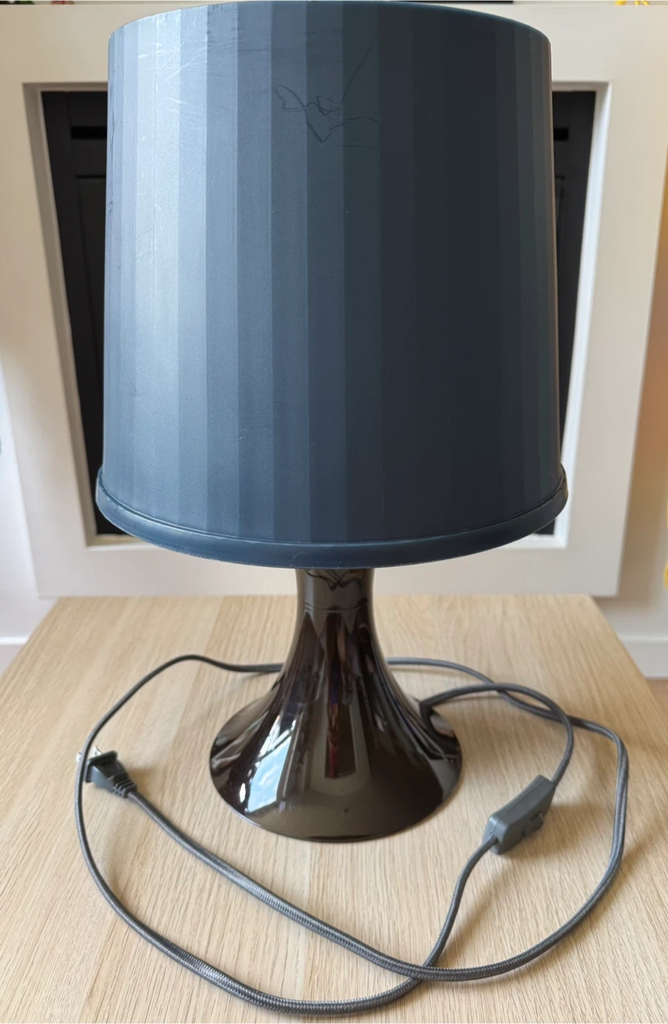 Selling an IKEA plastic table lamp with a blue shade and a dark brown base. Super light so it’s easy to maneuver. It creates soft lighting for a cozy mood. It's in good condition and would be a great addition to any room or office. NOTE: Light bulb included. Recommended bulb: E27 LED.