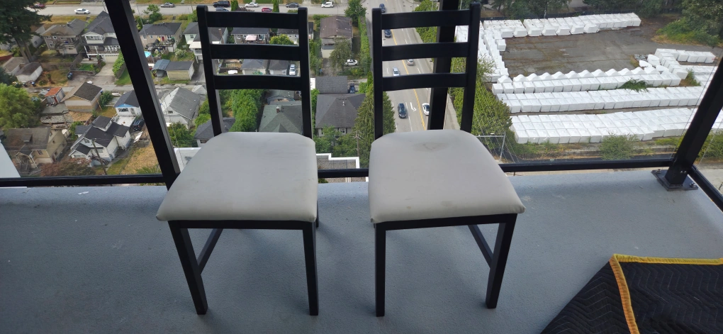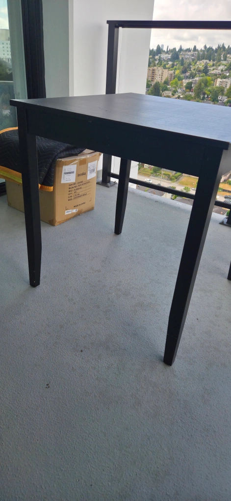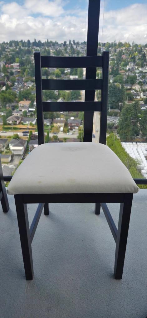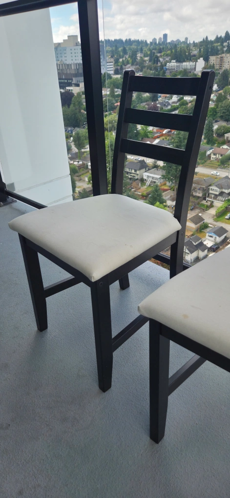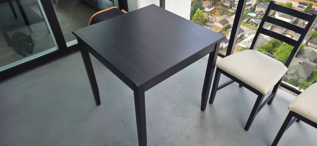Selling an IKEA Lerhamn table with two matching chairs! The set is in great condition and perfect for a small dining area or kitchen. The table and chairs feature a sleek black finish with light-coloured seat cushions. A great addition to any home!