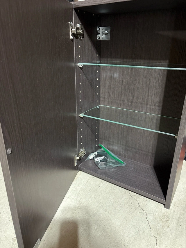 This is an Ikea Lillangen wall cabinet, perfect for adding storage to your bathroom or any small space. This unit features a sleek design with glass shelves and a dark brown finish. It's in good, used condition and ready to add a touch of organization to your home. Brand: Ikea Model: Lillangen Type: Wall Cabinet Shelves: Glass Finish: Dark Brown 40x21x64cm