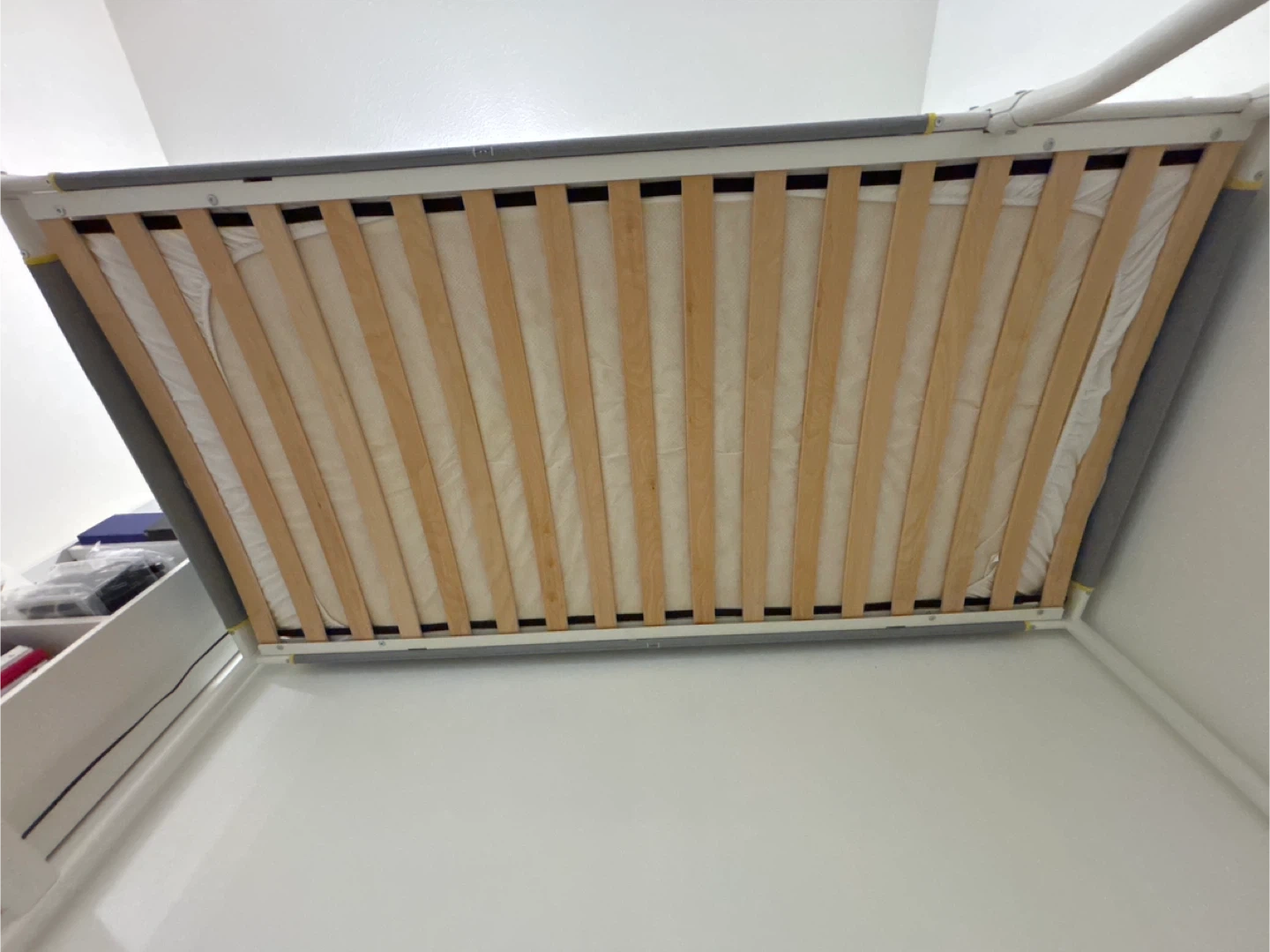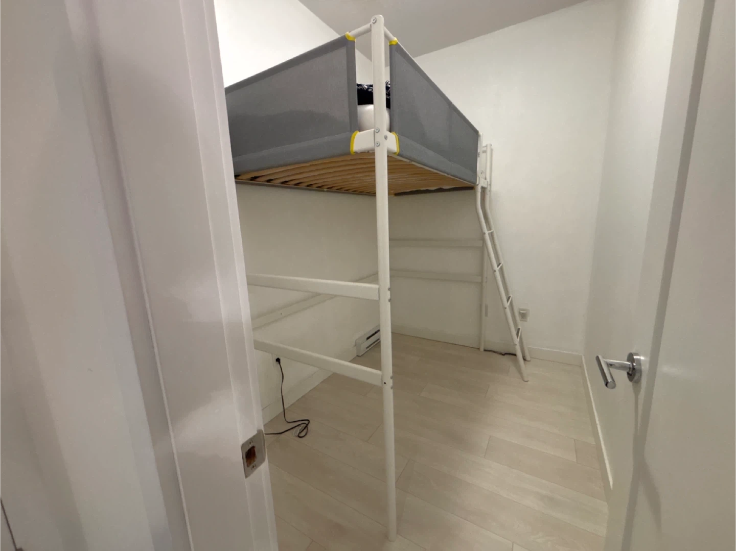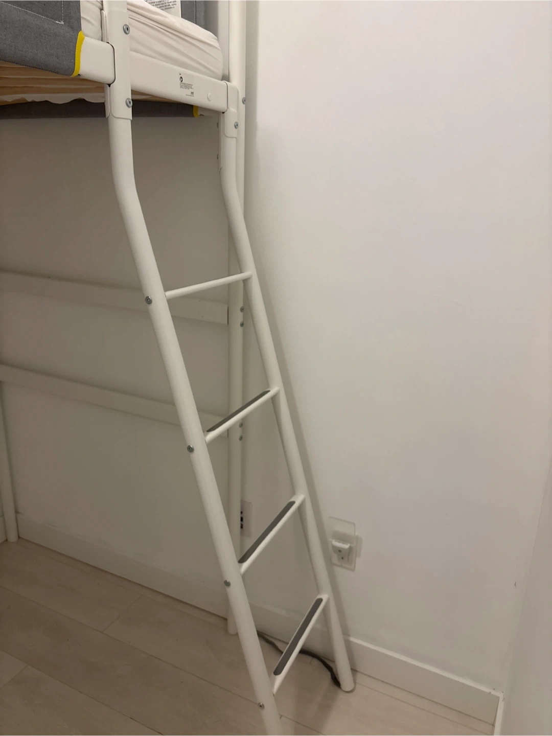 Selling an IKEA loft bed frame in white. It's in great condition and perfect for saving space. The frame is designed for a mattress that is 74 3/8 inches long (189 cm) and 38 1/4 inches (97 cm) wide. Please ensure the mattress thickness does not exceed 5 1/8 inches (13 cm).