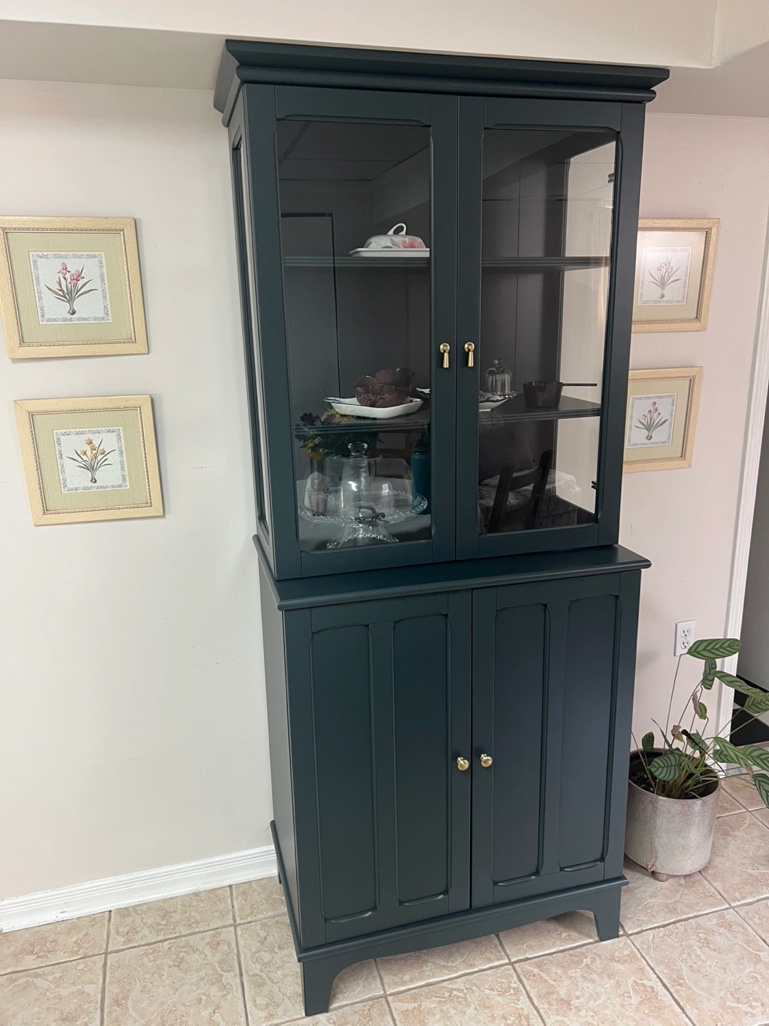 Elegant cabinet. Featuring glass doors. Brass handles. A perfect place to display your favourite items, perhaps a collection of porcelain figurines or decorative dishes. For pick-up only