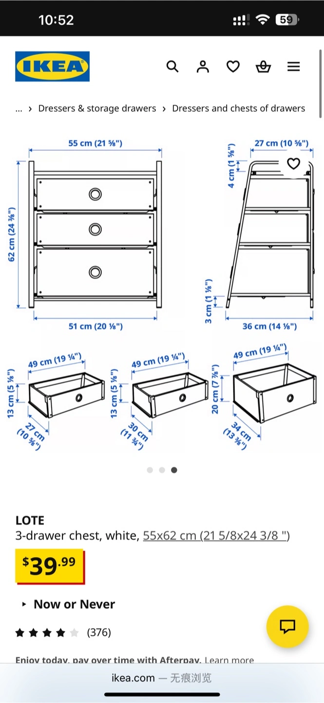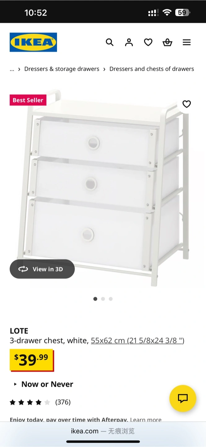 Looking to declutter? I'm selling an IKEA LOTE 3-drawer chest in white. It's in great shape and ready for a new home! - Dimensions: 55x62 cm (21 5/8x24 3/8 ") - Originally bought for $39.99