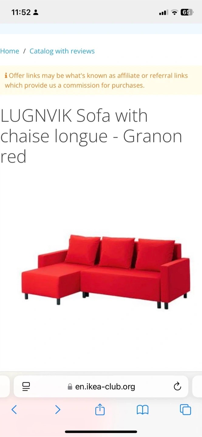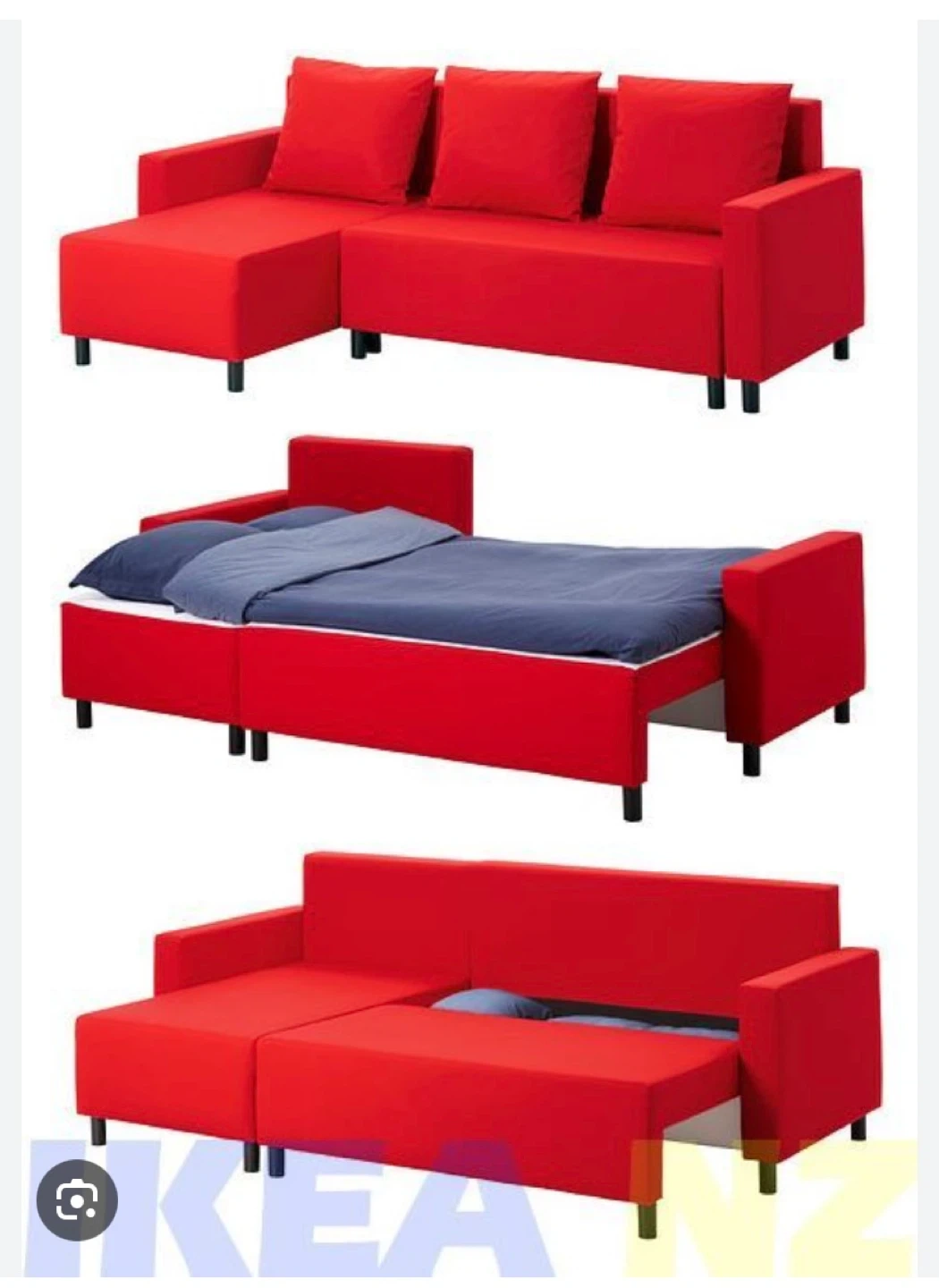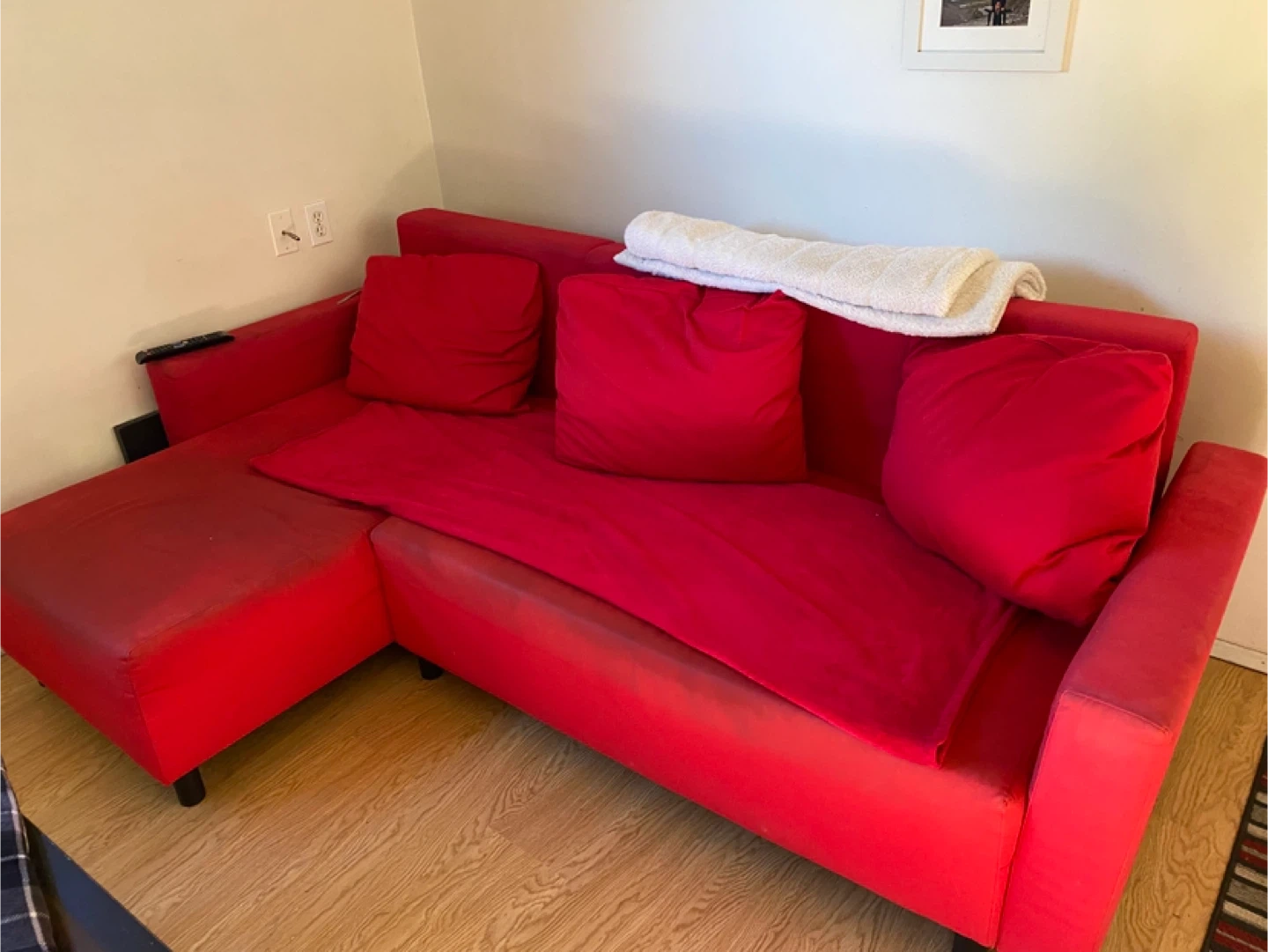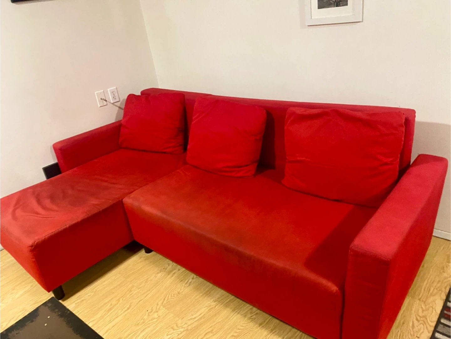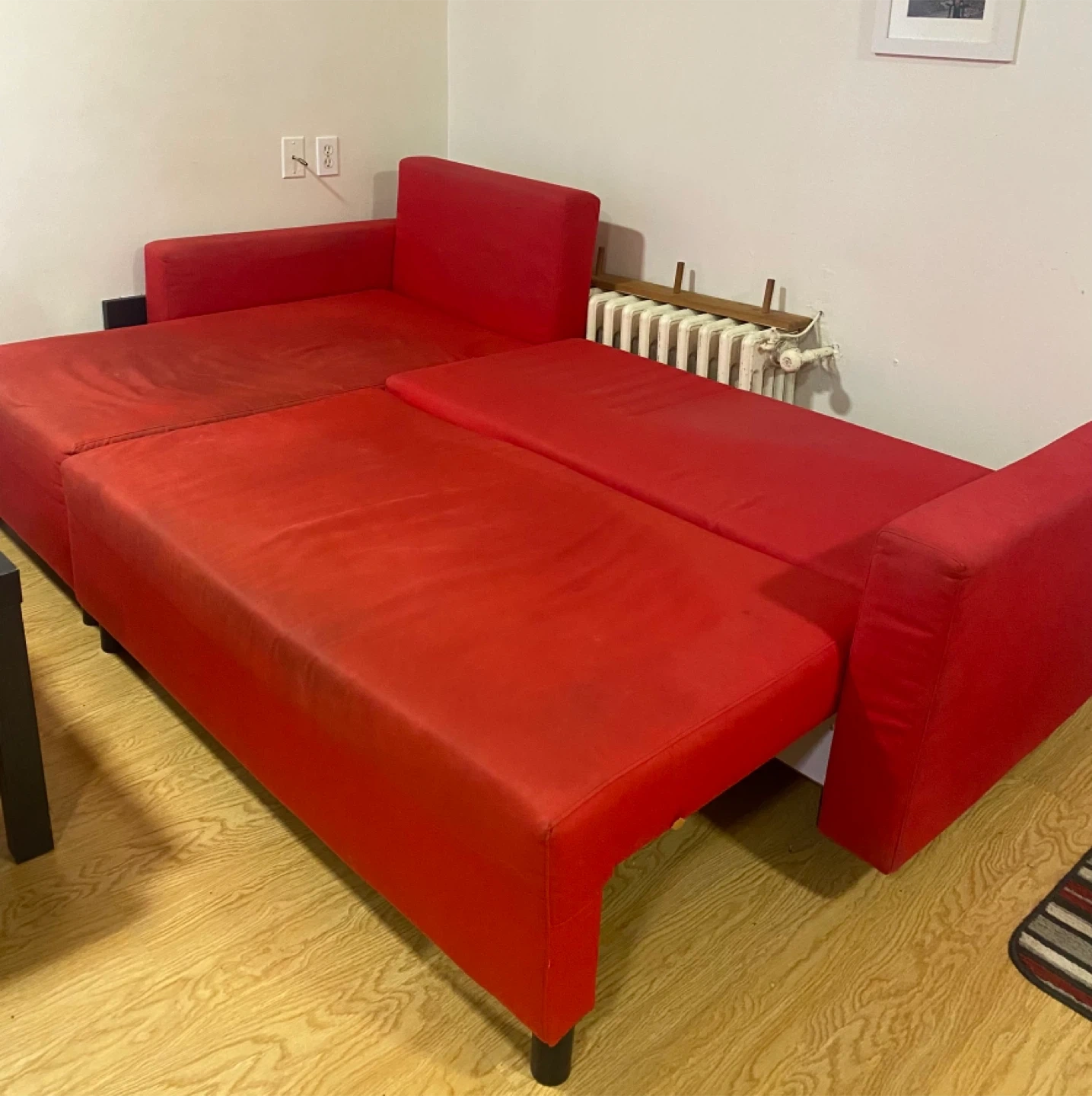 Selling a red IKEA LUGNVIK sofa with chaise longue! This sofa easily converts into a bed. It's a great space-saving solution for smaller apartments or guest rooms. It does show some signs of use, but it's still in good working condition. I can take the couch apart if needed for transport.