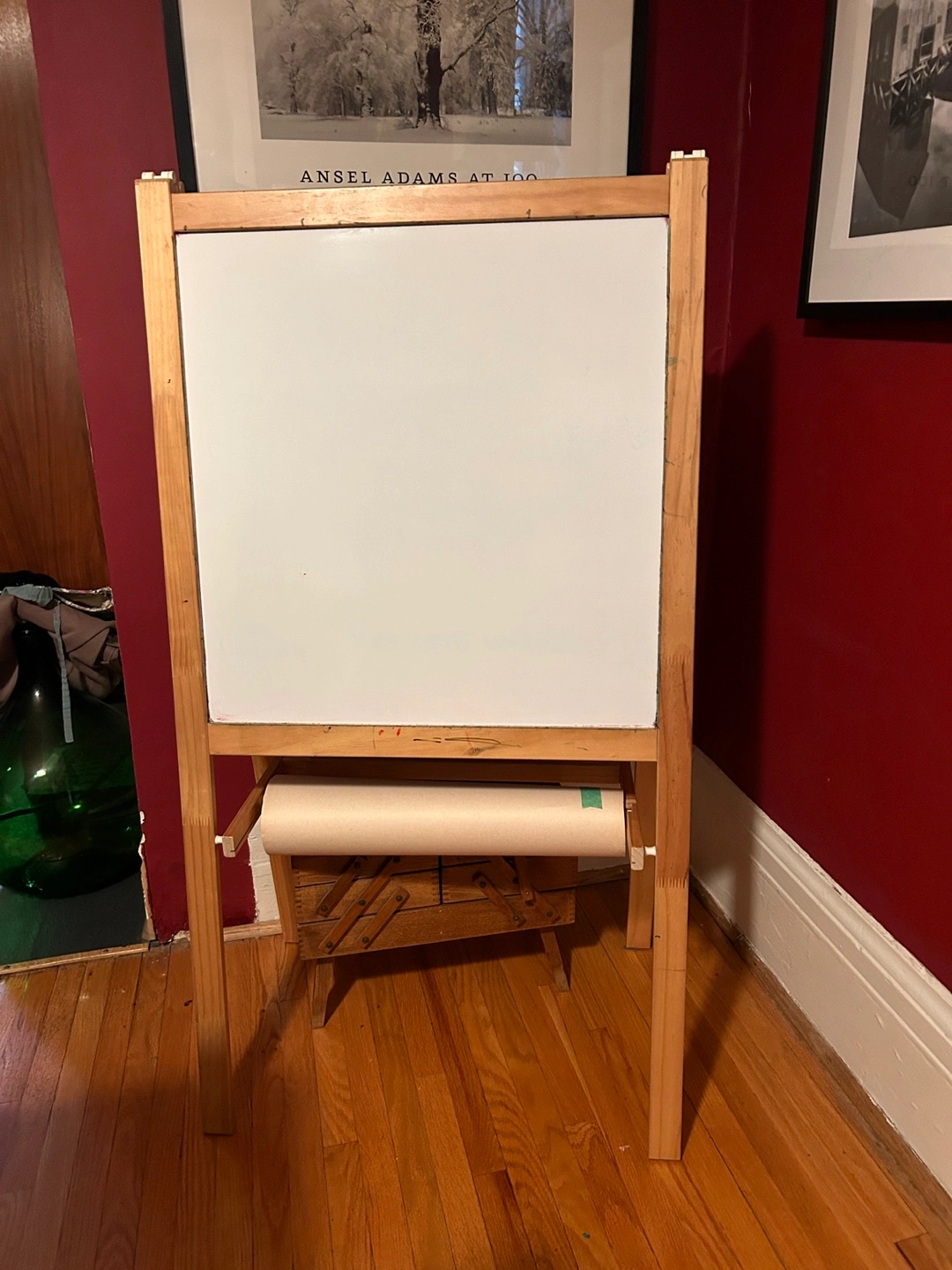 Not the current Mala, but a previous version from IKEA. It features both a chalkboard on one side and a whiteboard on the other. Still has a decent amount of paper on the roll for drawing projects as well. I can include the dry erase markers pictured (4), the brush eraser, and some chalk (if needed). Measures: 24.5” W x 46.5” H x 19” D Perfect for creative kids, announcing special occasions, and even the weekly meal planning chore which has been our main use since our kid aged up!