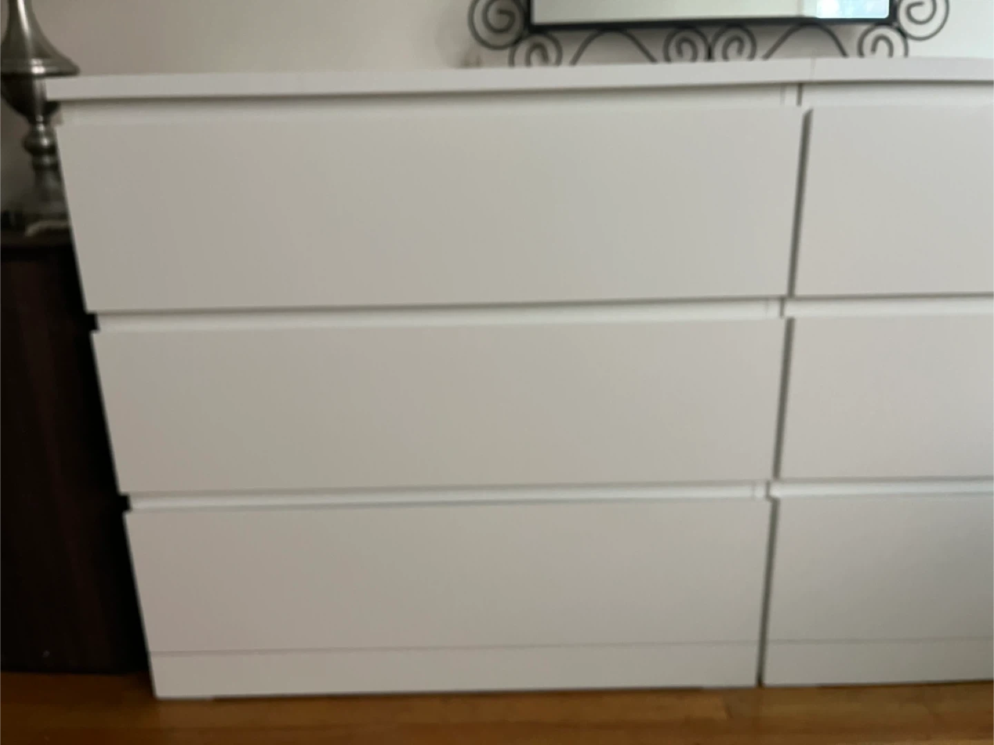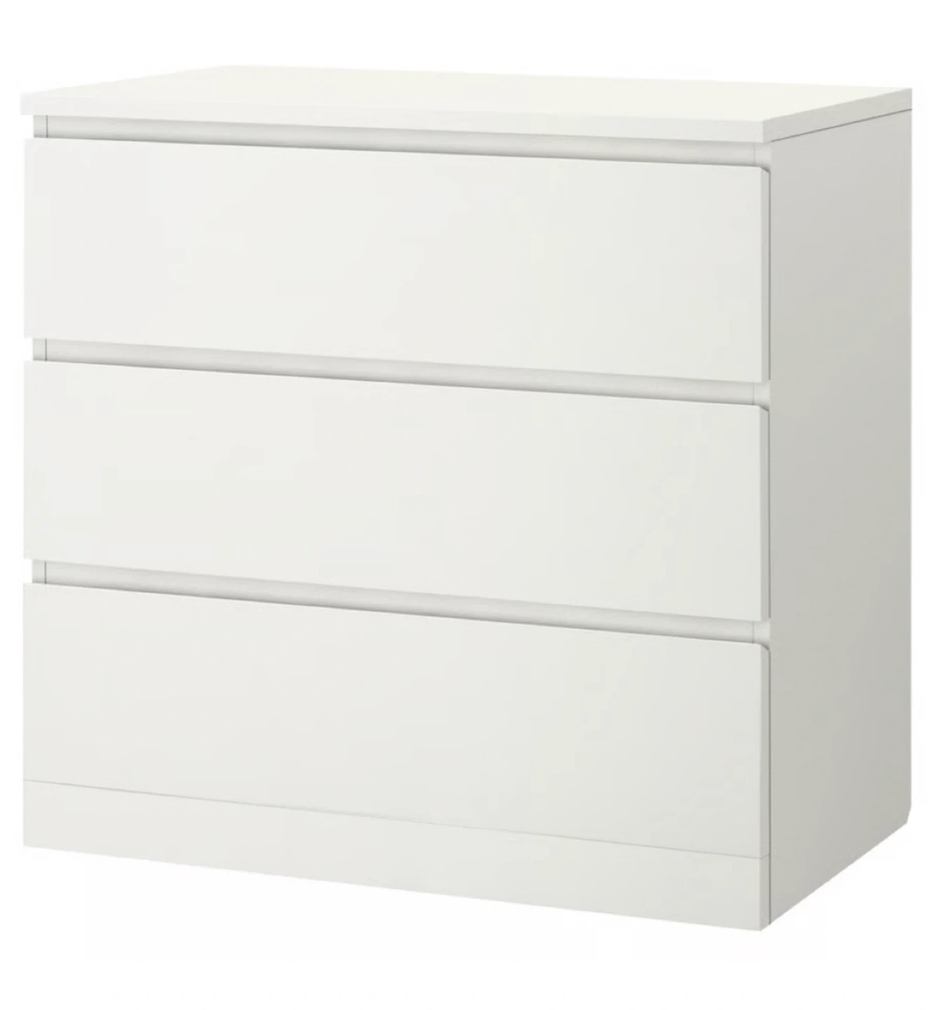 White IKEA Malm dresser with three drawers. Good working order with all drawers functional. $120 obo - Dresser on left in photos (I have been using two together to form a 6-drawer long dresser) - Great condition - Has chip in the wood at the back, bottom left (see photo) Dimensions are approx: 80cm wide, 78cm tall, and 48cm deep. Pick up only please.