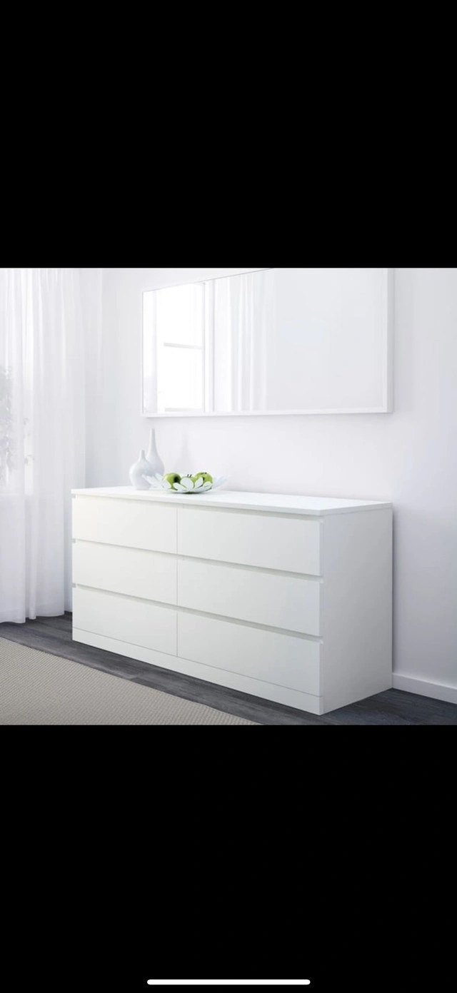 IKEA MALM 6-drawer dresser in white (wide 2×3). Clean, sturdy, and drawers slide smoothly. Cosmetics: small scuff on the top-left corner from moving (see close-up); otherwise only light wear—no swelling, chips, or structural issues. From a smoke-free, pet-free home. Size: 160W × 48D × 78H cm. Pickup: SmartStop Self Storage, 1450 Don Mills Rd, North York (storage facility, not a home). Cash or e-Transfer. Bundle discount if you take it with the nightstands or mirror.