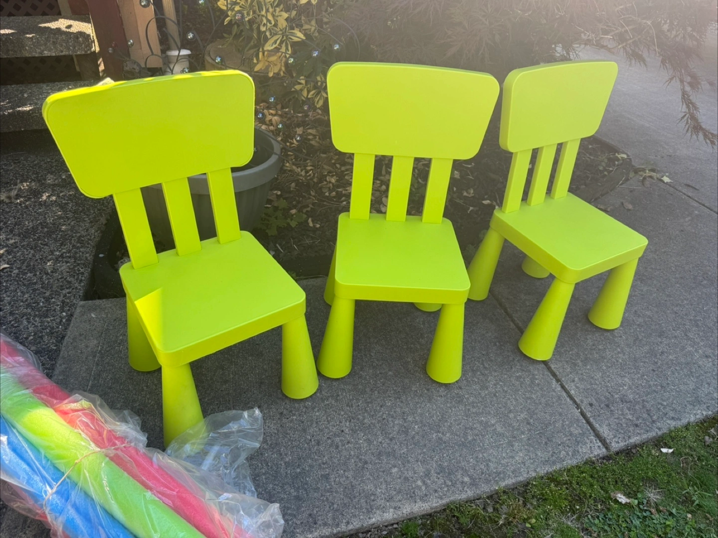 Selling three IKEA Mammut children's chairs in bright green! They're in great shape and perfect for little ones. I'm also including some colourful pool noodles for extra fun! Includes 7 pool noodles! BRAND NEW EDIT: pool noodles - SOLD