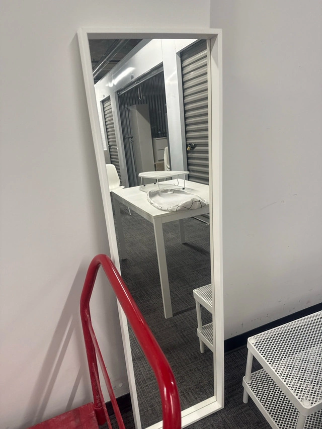 IKEA NISSEDAL full-length mirror with a clean white frame. Glass is clear with no chips or cracks; frame shows only light wear from normal use. Can be leaned against a wall or hung (mounting hardware not included). Perfect for bedroom, entryway or closet. Size: 65 W × 150 H cm (approx. 25.6” × 59”). Pickup: SmartStop Self Storage, 1450 Don Mills Rd, North York (storage facility, not a home). Cash or e-Transfer.