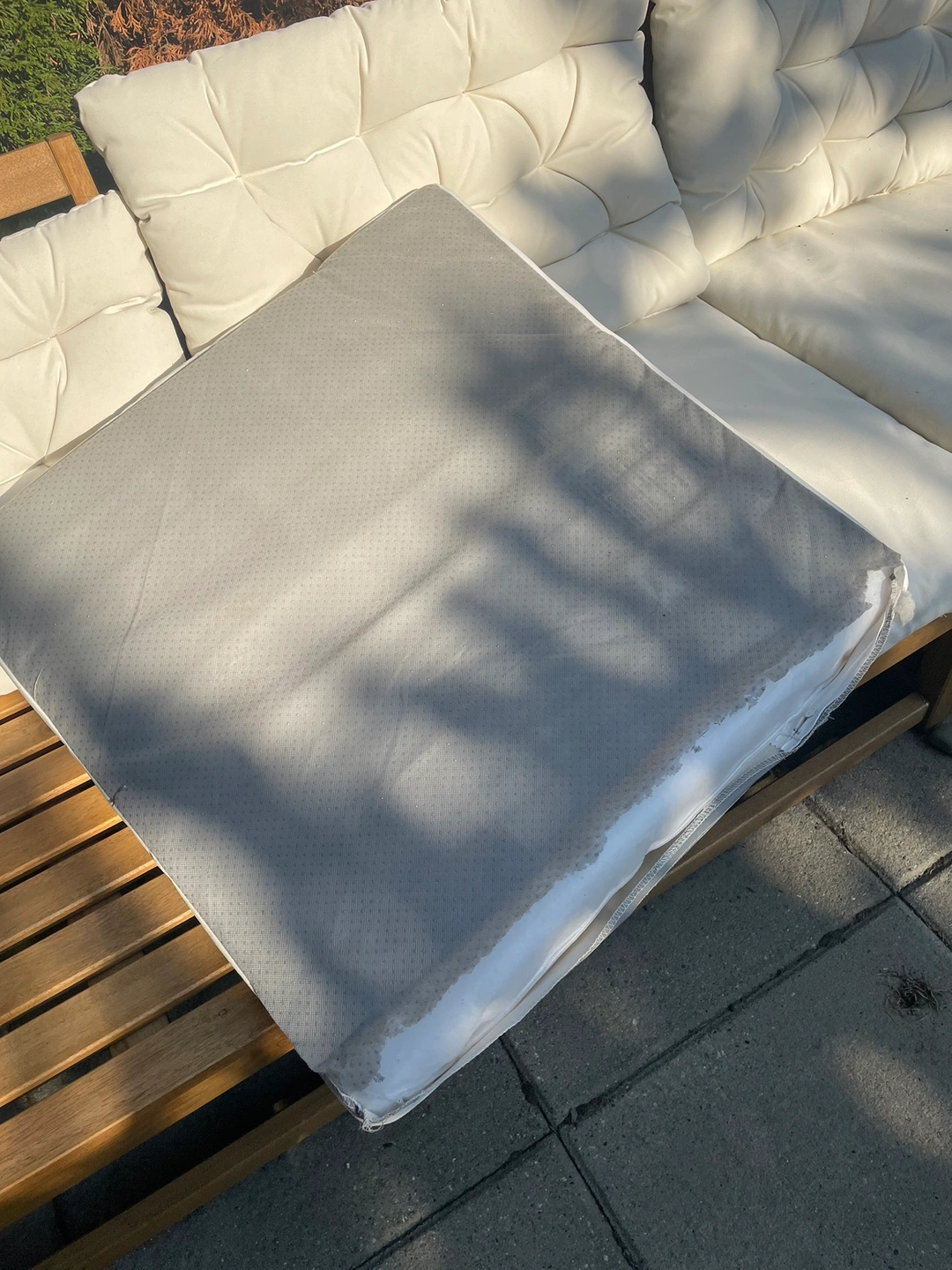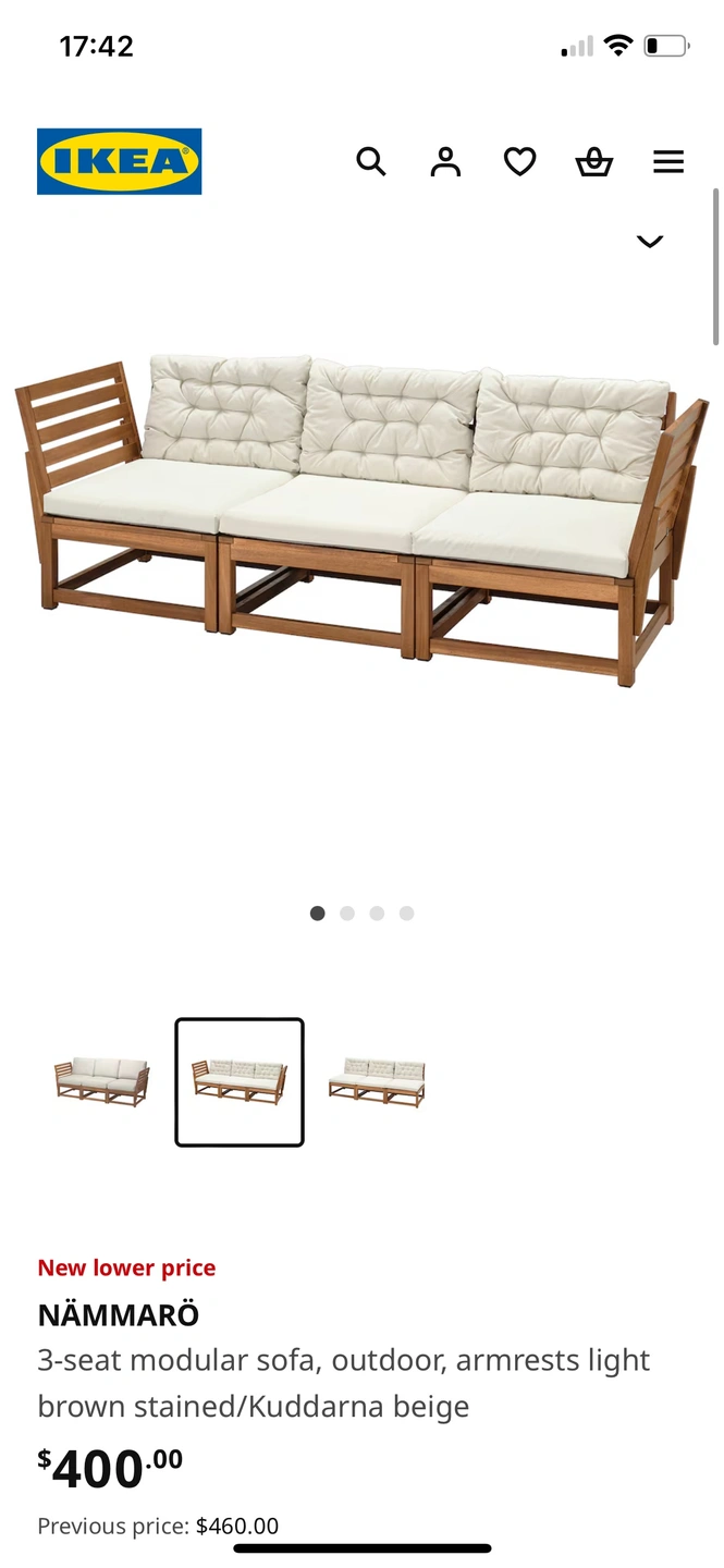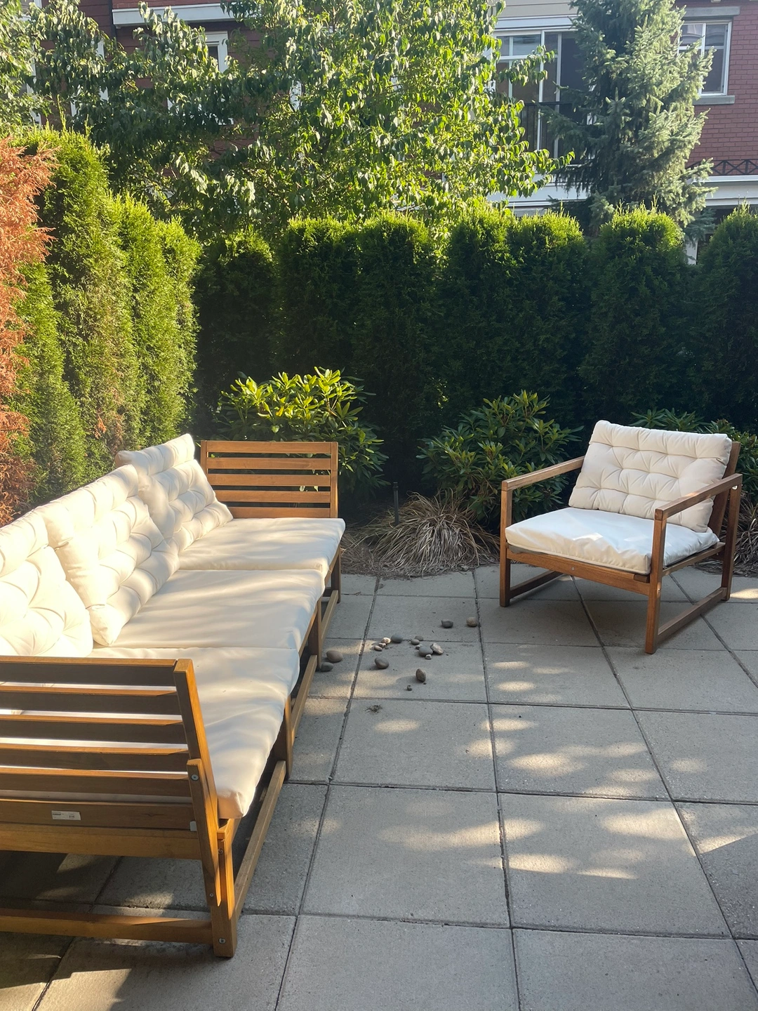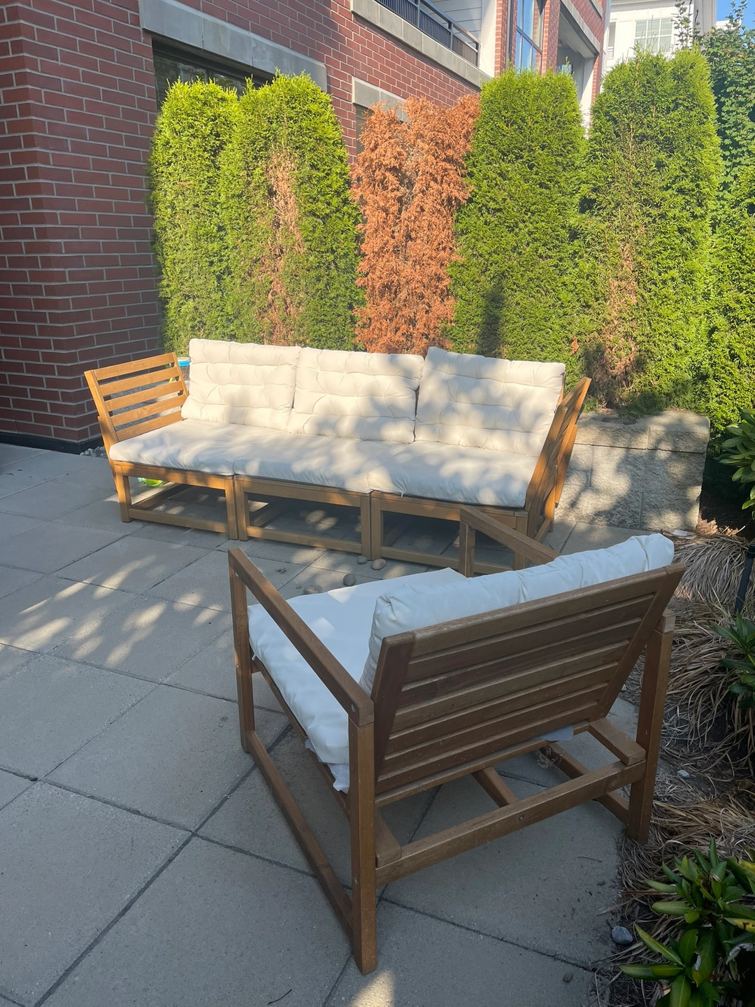 This is a four-piece patio set that includes a three-seater couch and a single armchair. All pieces come with cushions. Please note, 3 cushions have a rip on the bottom. Not noticeable when they’re down on the seats.