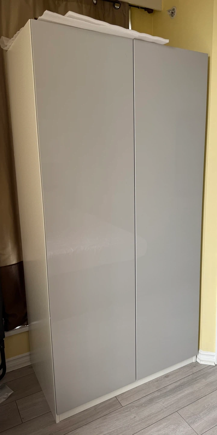 Selling a light grey IKEA PAX wardrobe. It's in great condition and ready for a new home. Perfect for adding extra storage to any room! Very spacious with 4 shelves and 3 large metal mesh drawers (36 7/8 x 5 1/2”) and a provision for hanging clothes as well.