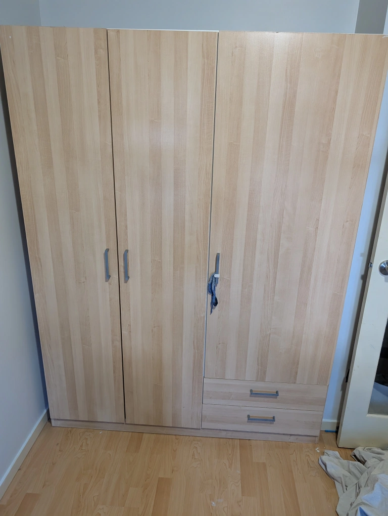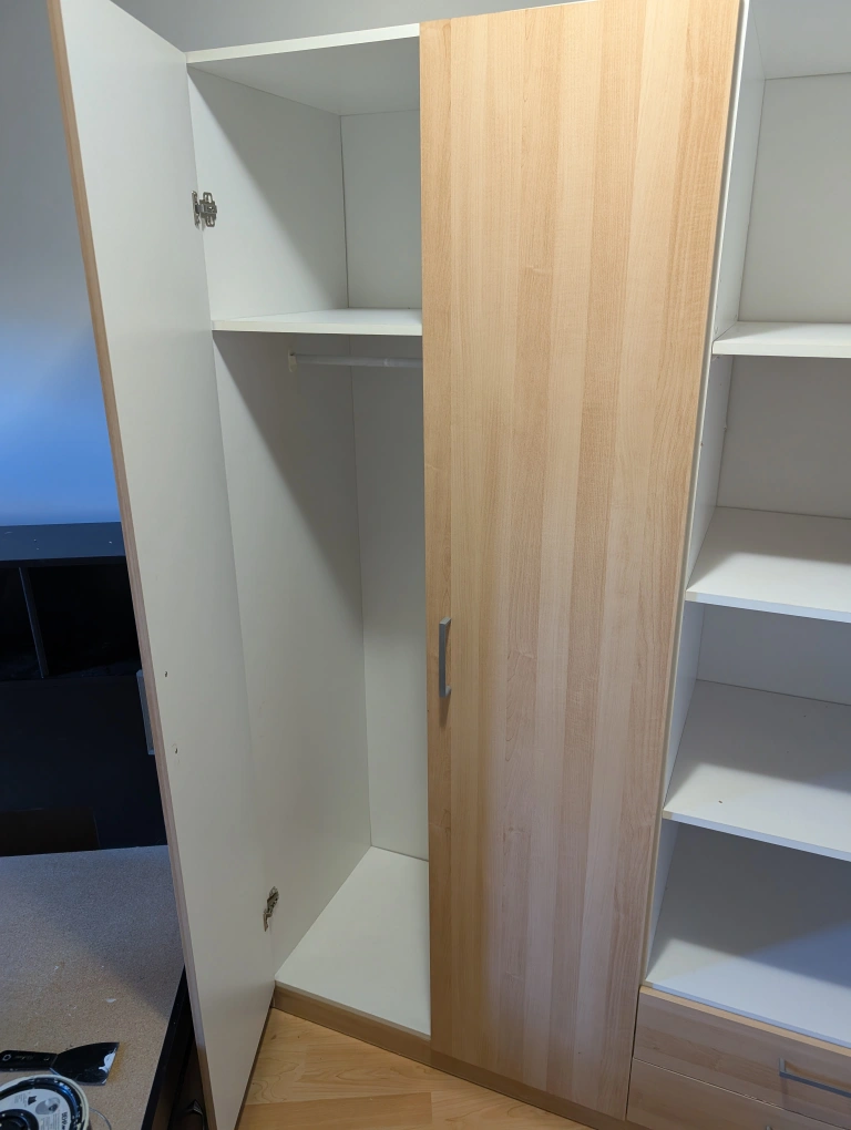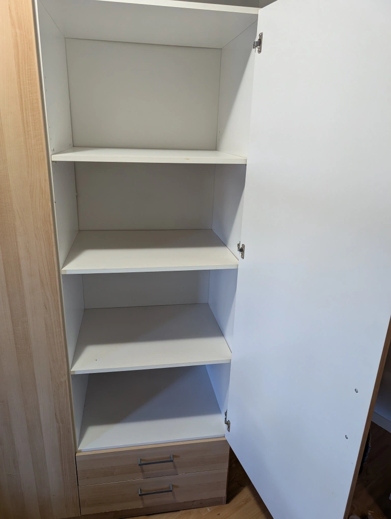 Selling an IKEA PAX wardrobe. It has shelves, a hanging rod, and drawers for storage. The wardrobe is in good condition and ready to be used in your home. no delivery, as is .