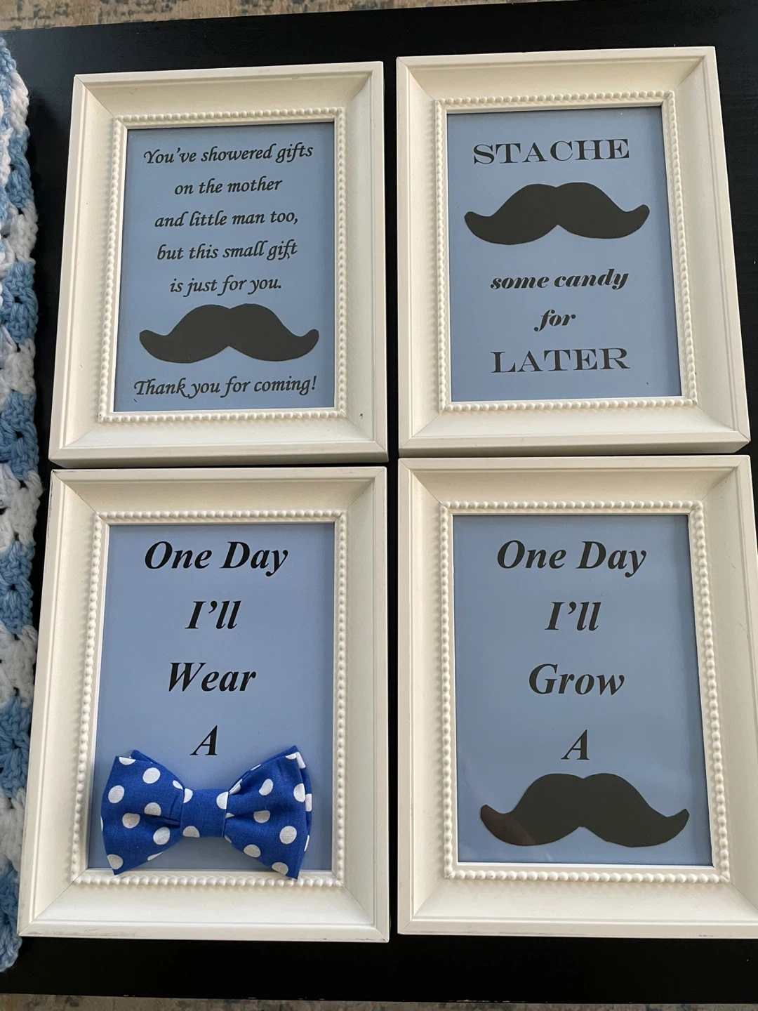 4 Picture frames from ikea were personalized for a baby boy shower no glass inserts. Were used for a couple of hours for shower.