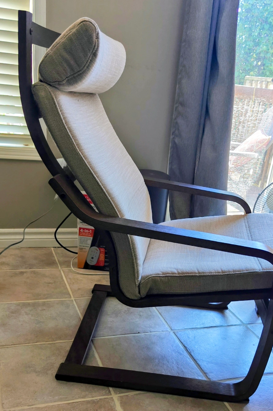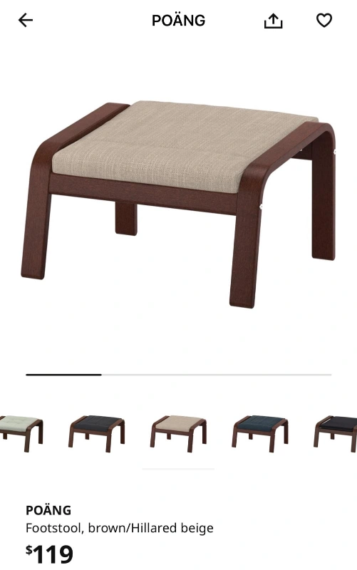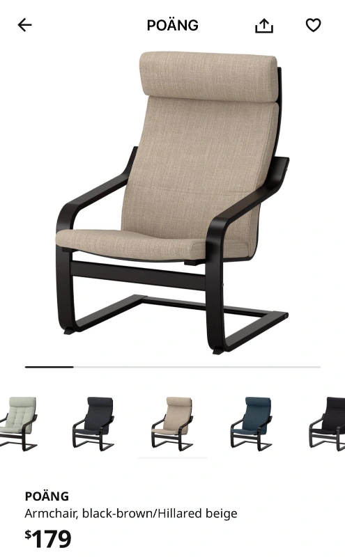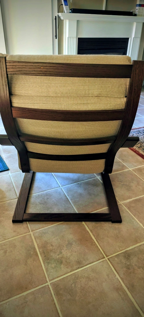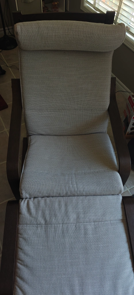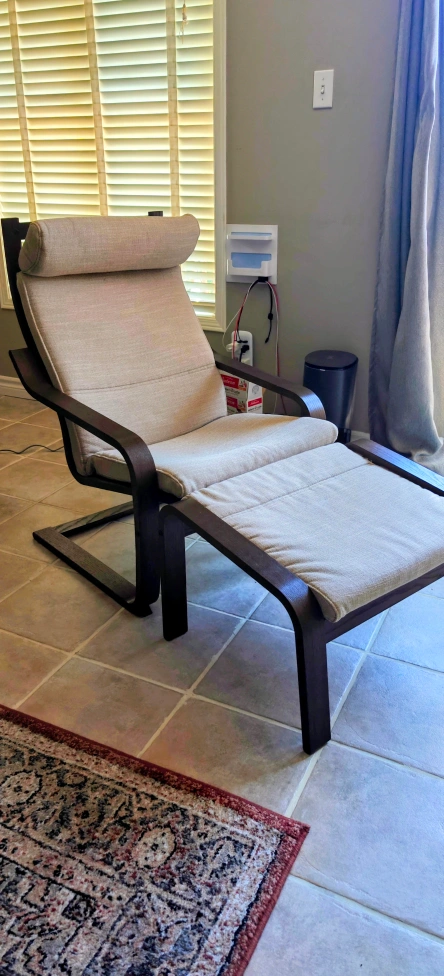 Selling an IKEA POÄNG armchair with a matching footstool. The chair features a comfortable headrest and a brown frame with Hillared beige cushions. The footstool is the same colour and style. Great for relaxing!