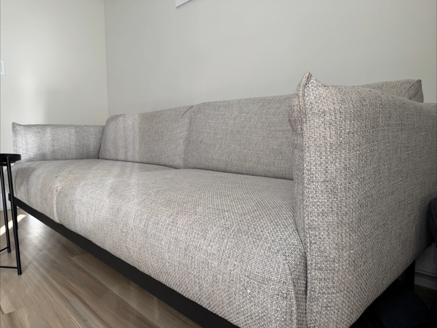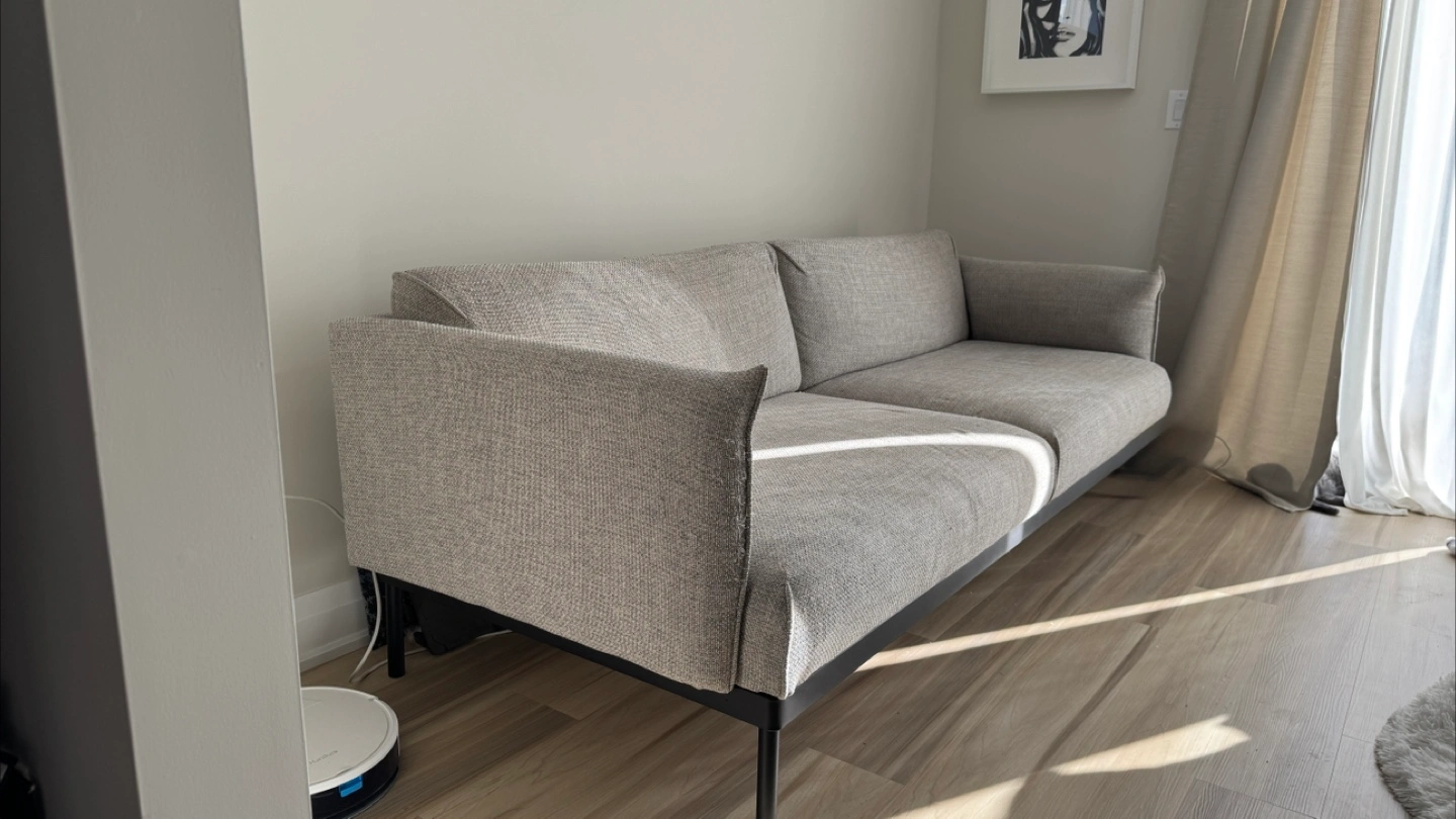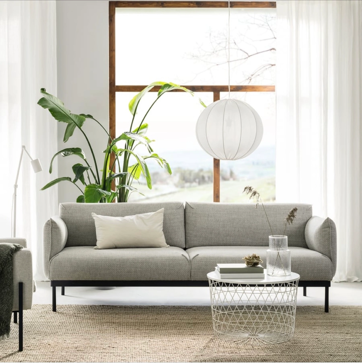 *No Delivery *Original Price: $1090 Selling a comfy grey sofa! It's in great condition and would look great in any living room. The fabric is a neutral grey colour, and the frame has a modern design with black legs. It's a stylish and comfortable piece of furniture! IKEA ÄPPLARYD Sofa, Lejde light gray W: 91” (231cm), D: 36” (93cm), H: 32” (82cm)