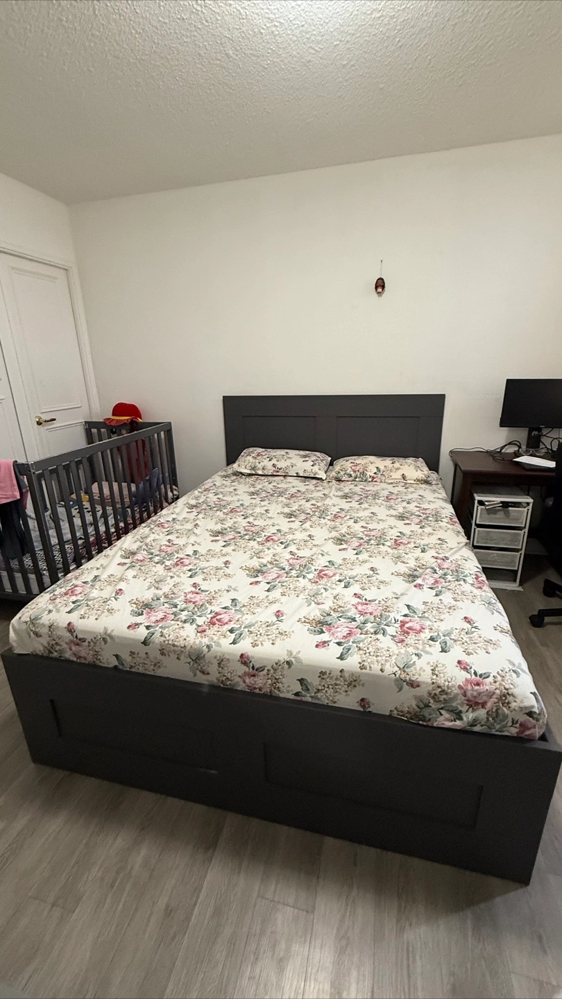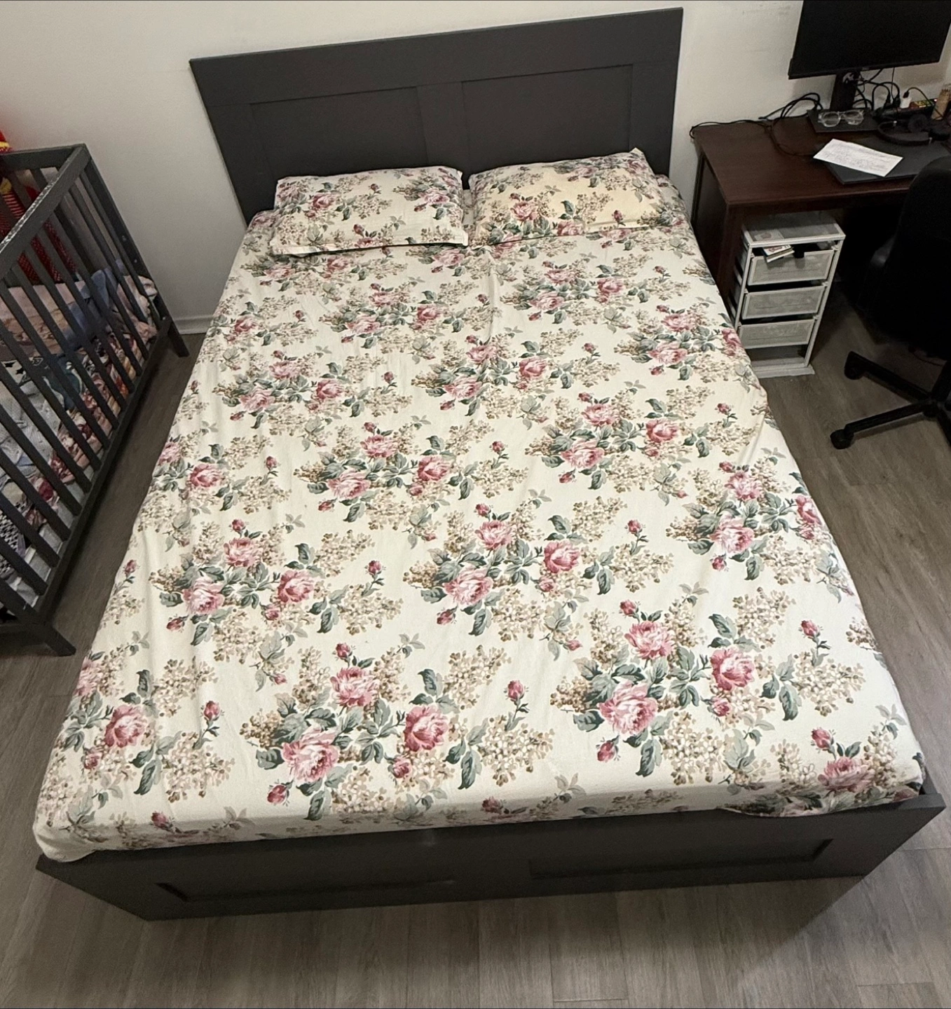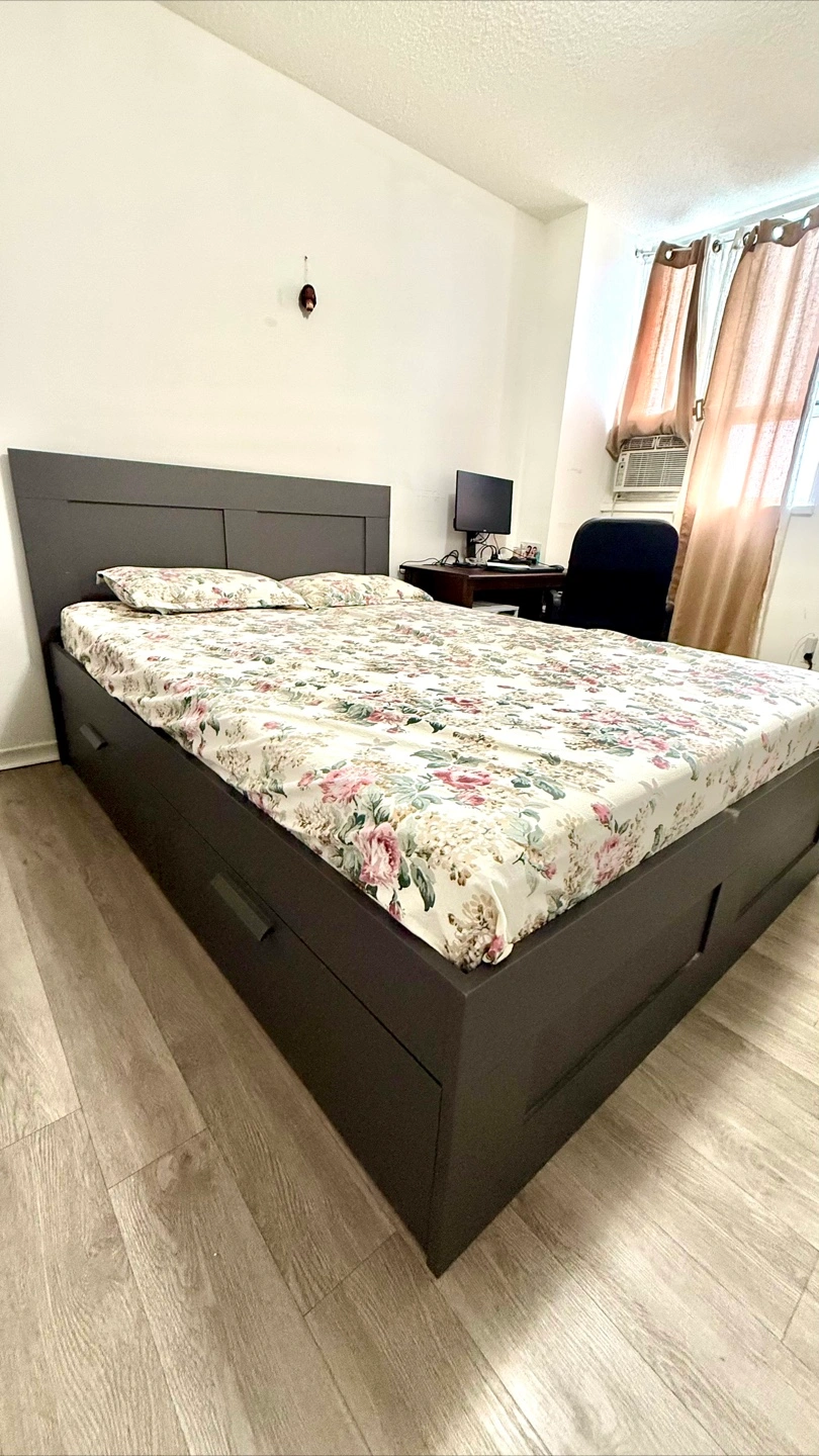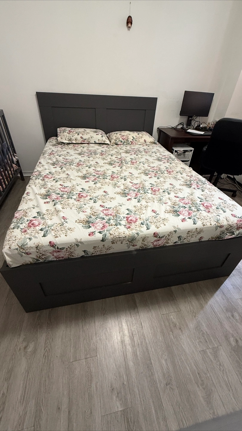 Selling a queen size bed frame with hard mattresses in great condition with 4 storage. This bed frame would be perfect for a master room or for anyone looking to upgrade their sleeping space. It's sturdy and ready for a new home.