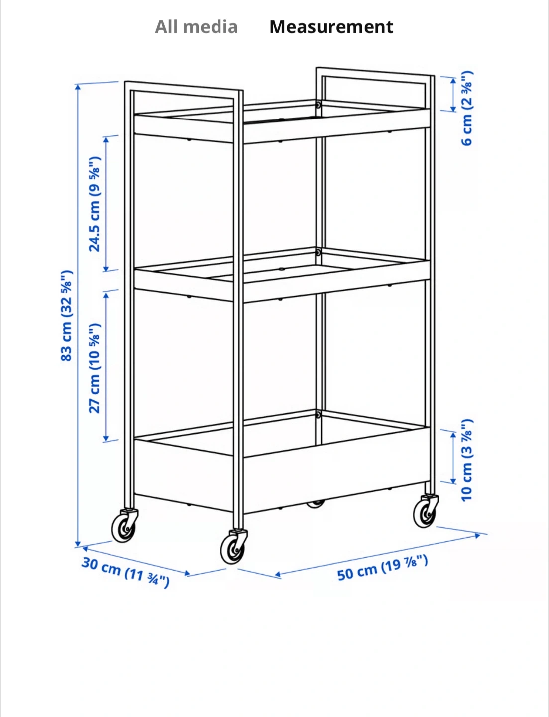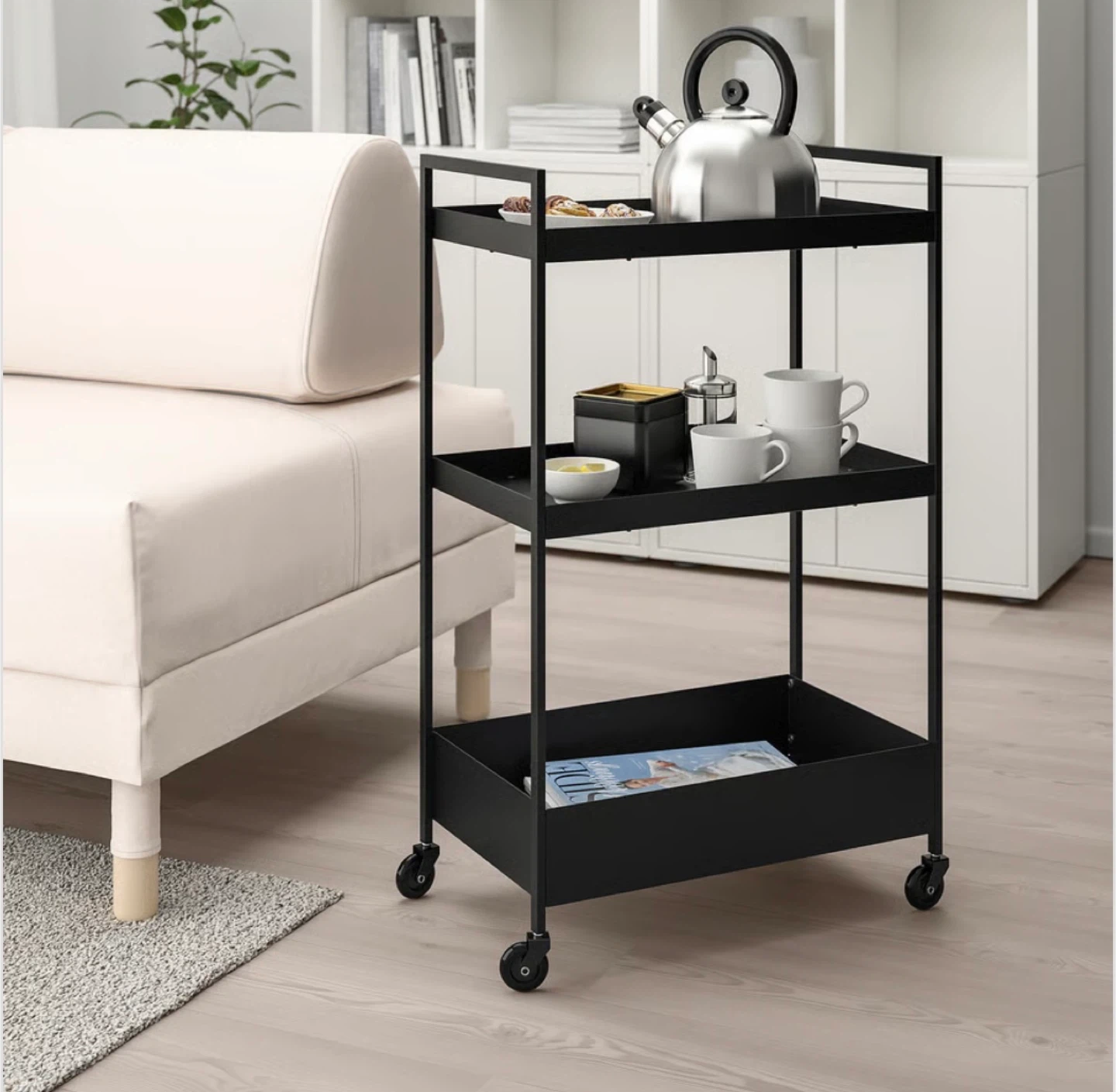 Looking to sell my IKEA RÅSHULT utility cart in black! It's super handy for extra storage in the kitchen, bathroom, or anywhere you need a little more space. The cart is compact, so it fits even in small areas, and the sturdy construction means it can handle a fair bit of weight. Dimensions are approximately 50 cm x 30 cm and 83 cm tall