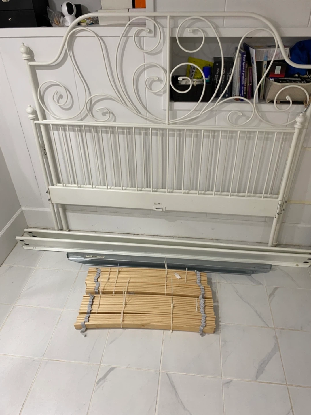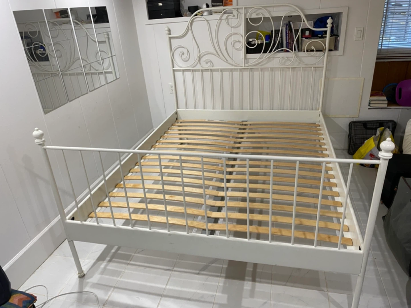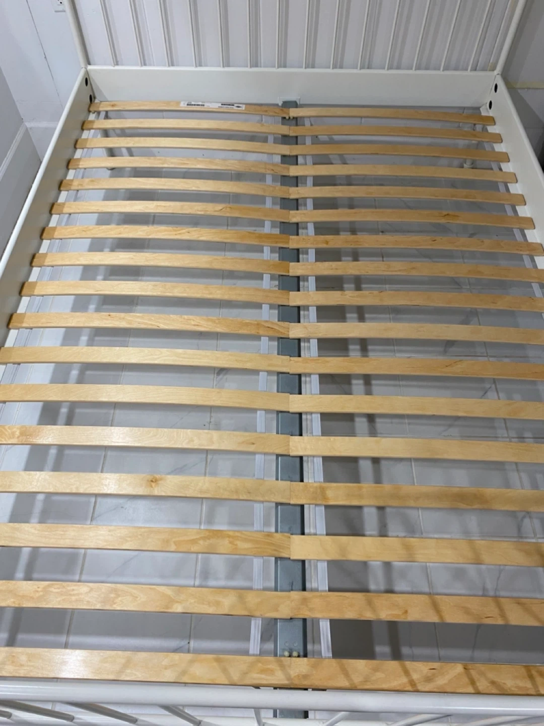 Selling a white IKEA bed frame. It's in good condition and has a lovely, classic design. The frame is sturdy and ready for a new home. The height is approximately 140cm and the width is about 150cm. Perfect for adding a touch of elegance to your bedroom! ** Pet Free and Smoke Free Home**