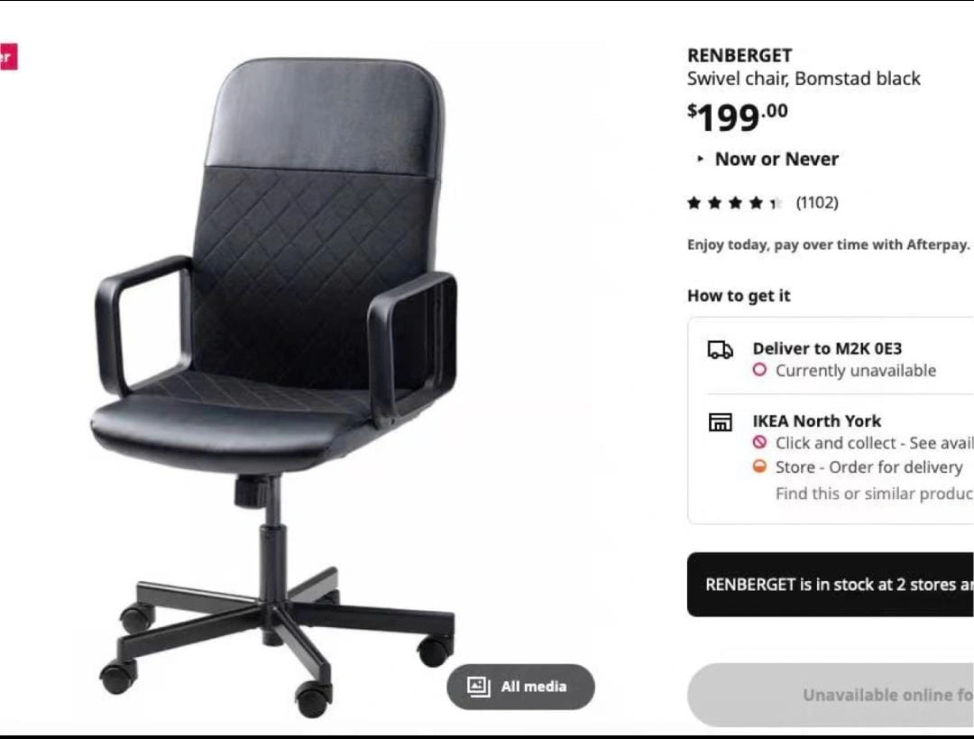 Selling an IKEA Renberget swivel chair in Bomstad black! It's in great condition and ready to add some comfort to your workspace. Originally bought for $199.00 Selling for just 60$ Also check my other Listings too✅