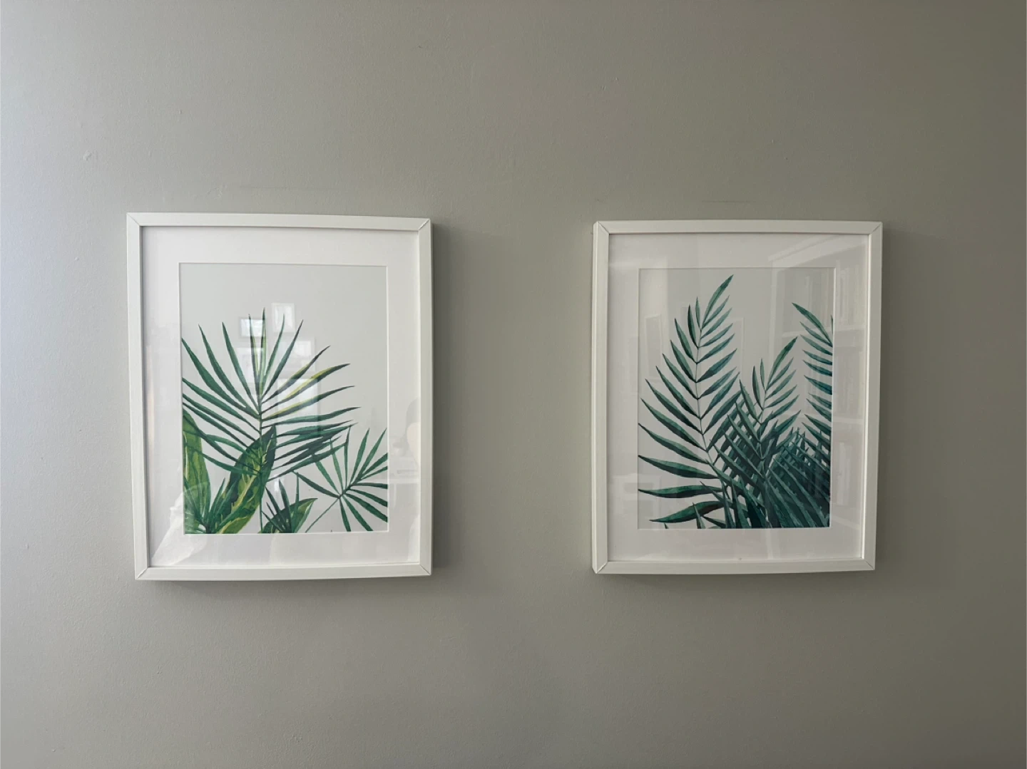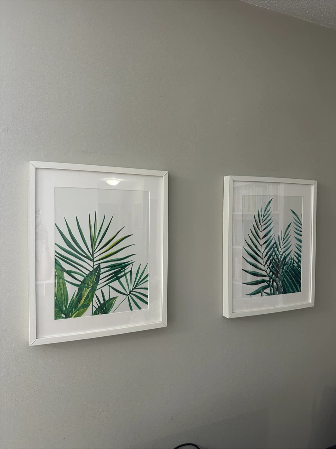 Selling a set of two IKEA white wall art frames featuring tropical leaves. They have a clean, modern look and would be perfect for adding a touch of nature to your home decor. The frames are in good condition, but the paint on the corners is slightly loose (but still, it’s not peeled off and will look just fine if kept as is). There’s no scratches or any damage to the frames expect that. The frames have plexiglass. Art is included — a set of green leaves to give some cozyness to your room. 🌱 Brand: IKEA Model: RIBBA Frame Size: 43cm x 53cm x 3.5cm Not available at IKEA anymore.