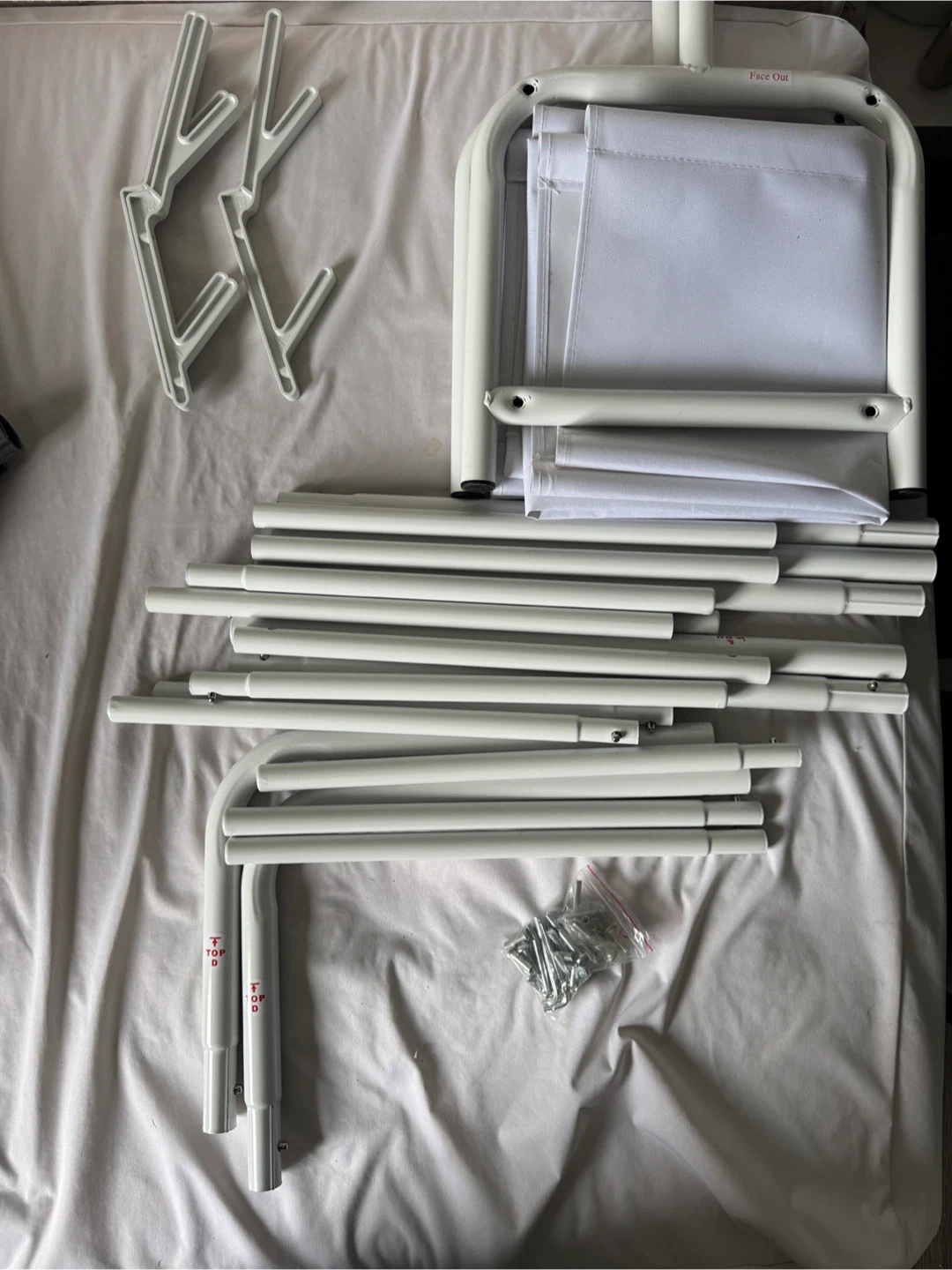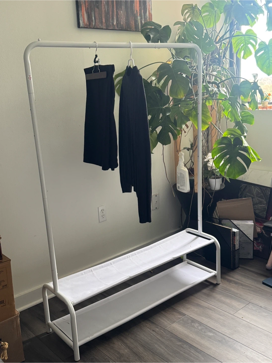 Selling a white IKEA RIGGA clothes rack! It's in great shape and ready to help organize your clothes. Easy to assemble and disassemble, making it perfect for small spaces or moving. The rack includes a shelf at the bottom for shoes or storage boxes. Get your wardrobe sorted with this handy piece!