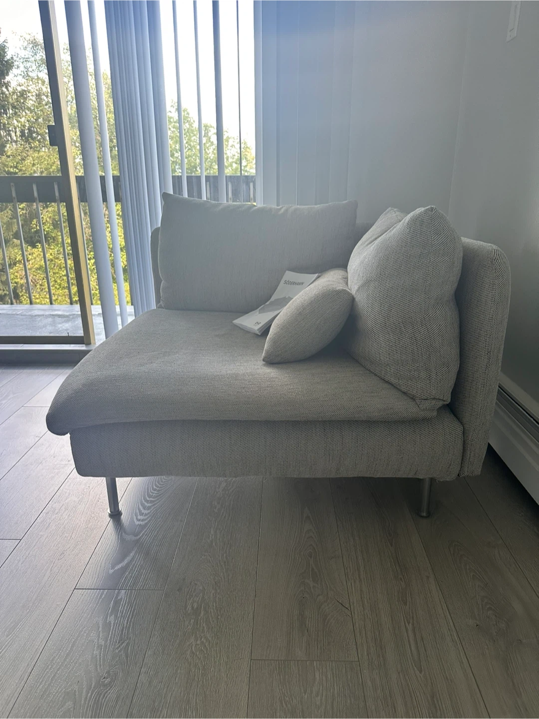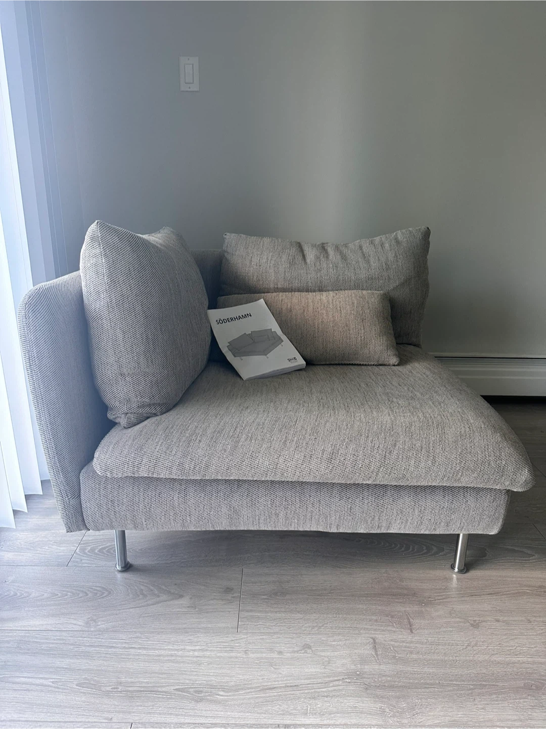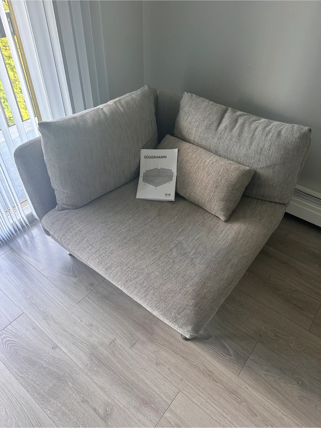 Selling a comfortable IKEA SÖDERHAMN sectional sofa. It's in great condition and features a modular design, so you can arrange it to fit your space. The light grey colour is neutral and will match any decor. Includes all cushions shown in the photos. The SÖDERHAMN series is known for its deep seats and soft cushions, making it perfect for lounging!