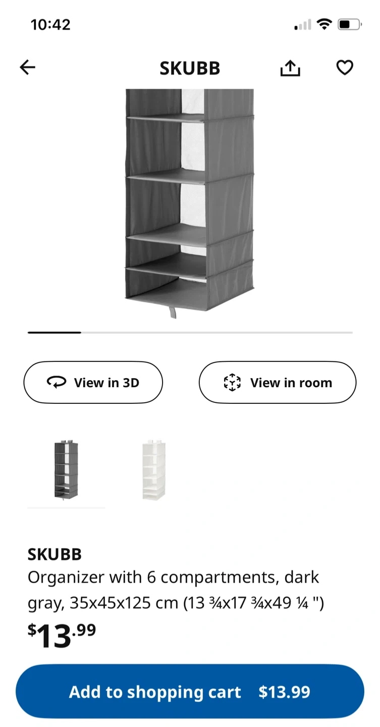 Selling an IKEA SKUBB organizer in dark gray! It comes with 6 compartments, perfect for organizing your closet or storage space. The dimensions are 35x45x125 cm (13 ¾x17 ¾x49 ¼ "). Originally bought for $13.99