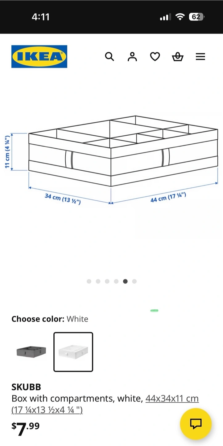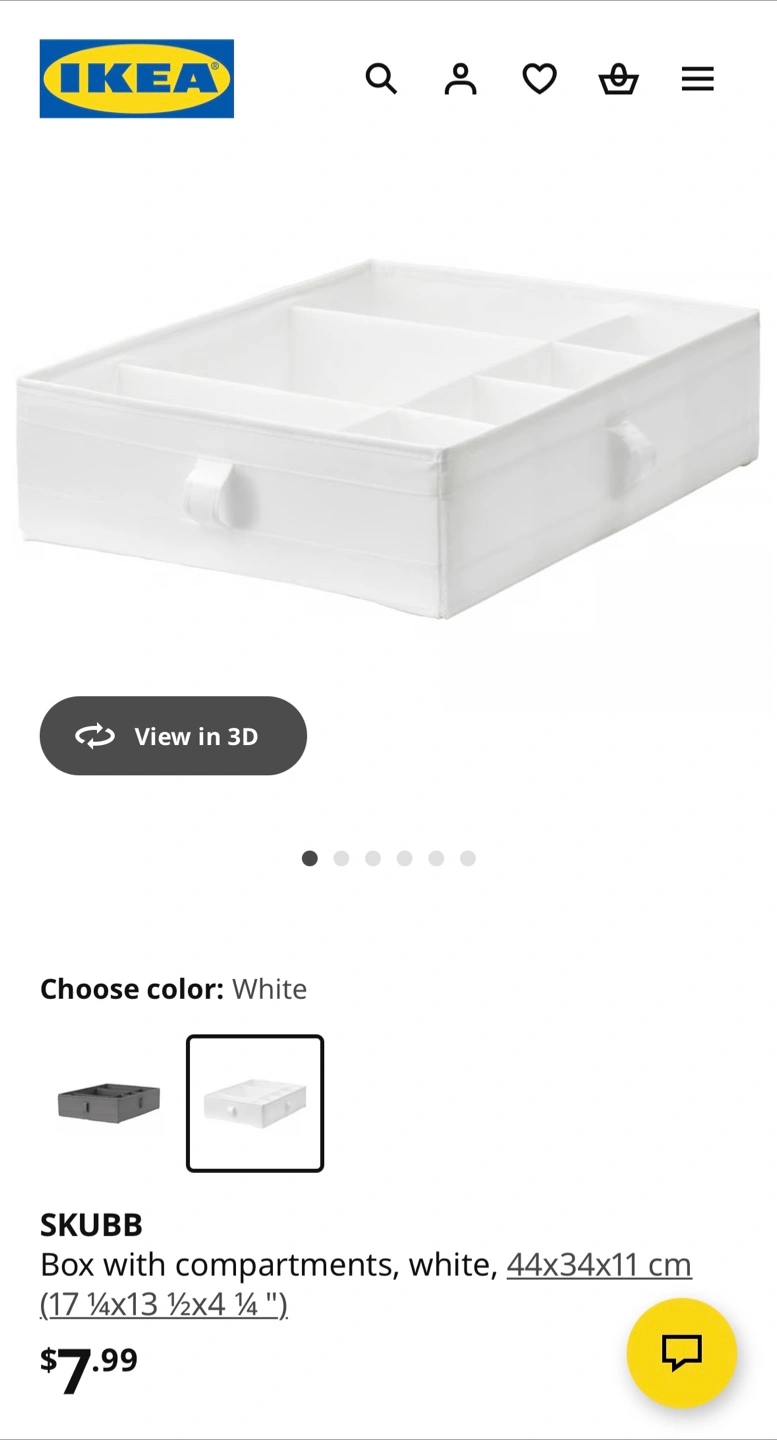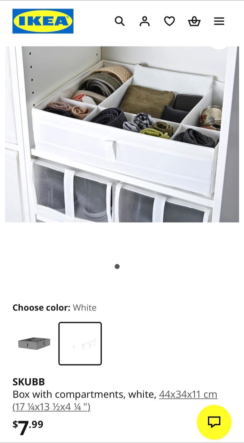 I'm selling a brand new IKEA SKUBB box with compartments in white! It's still in its original packaging. The dimensions are 44x34x11 cm (17 ¼x13 ½x4 ¼ ")