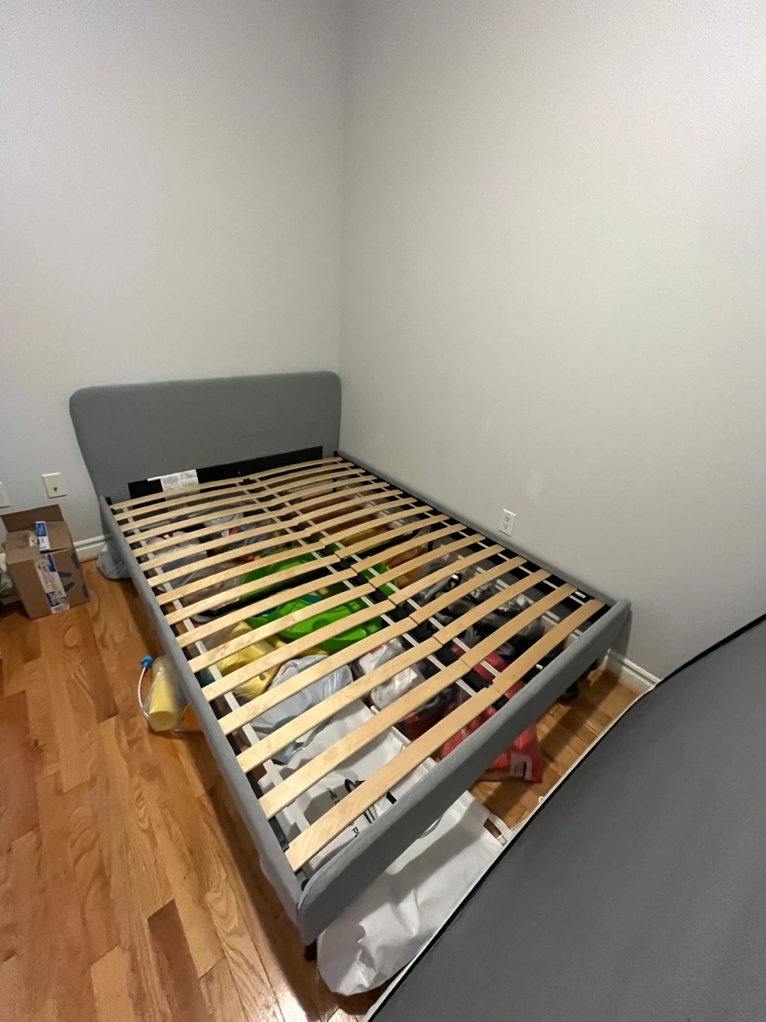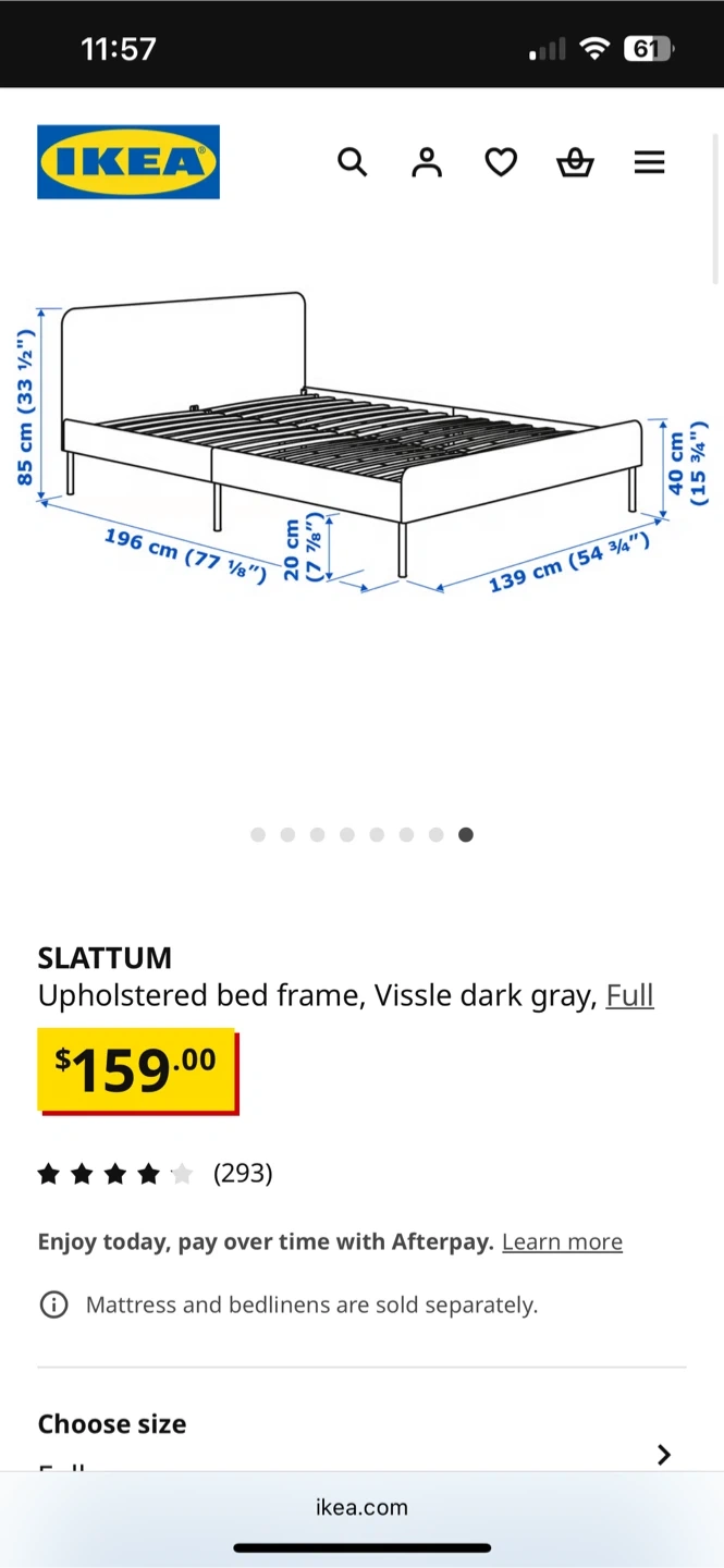 Selling an IKEA SLATTUM upholstered bed frame in Vissle dark gray, size full. It's in great condition and ready for a new home! The dimensions are 196 cm x 139 cm. Originally bought for $159. Mattress and bed linens are sold separately