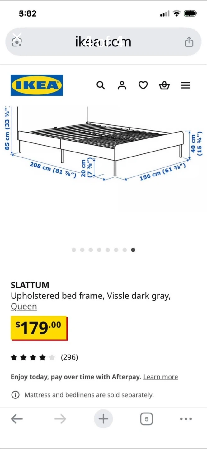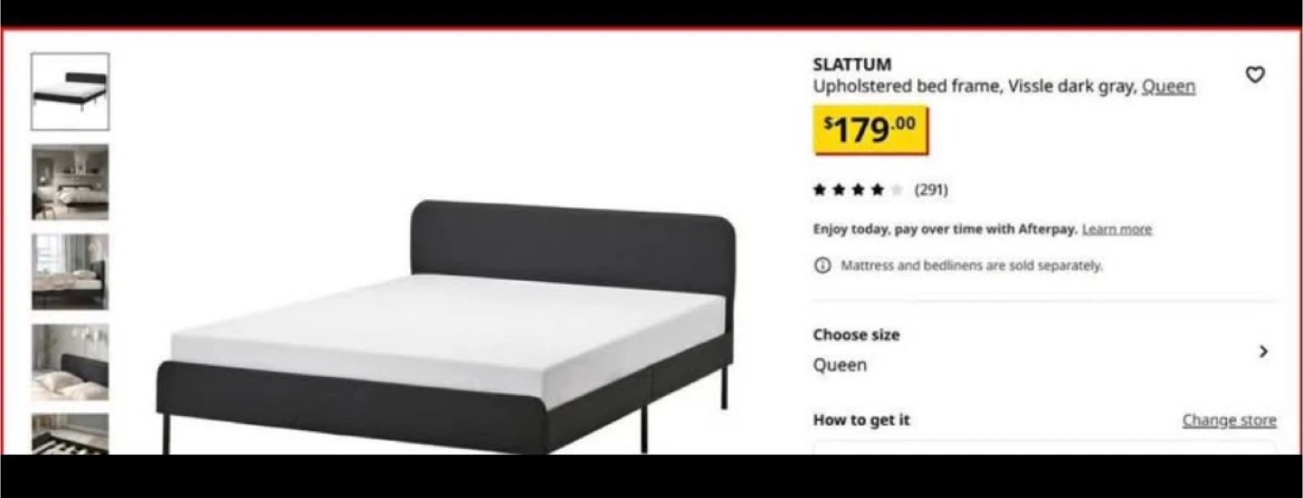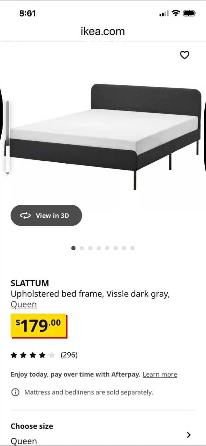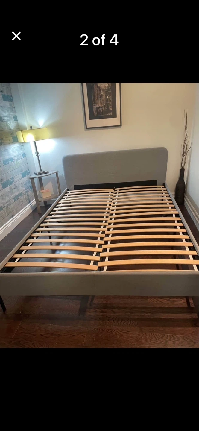 Selling an IKEA SLATTUM upholstered bed frame in Vissle dark gray, queen size. Originally bought for $179. Mattress and bed linens are sold separately. Dimensions are 208 cm (81 7/8") x 156 cm (61 3/8")