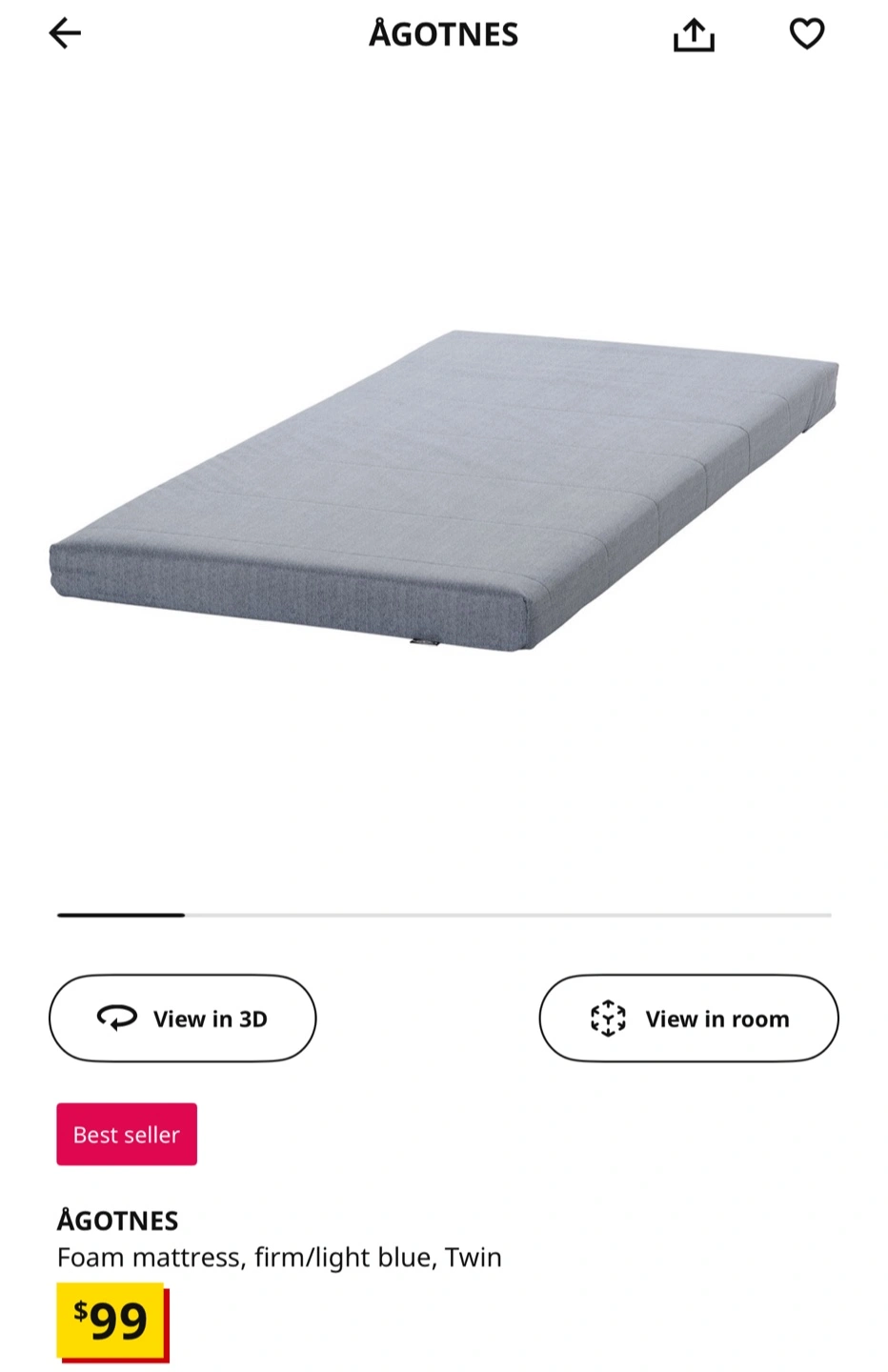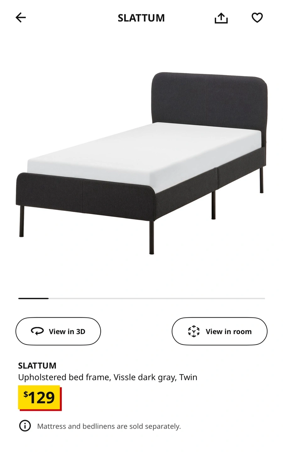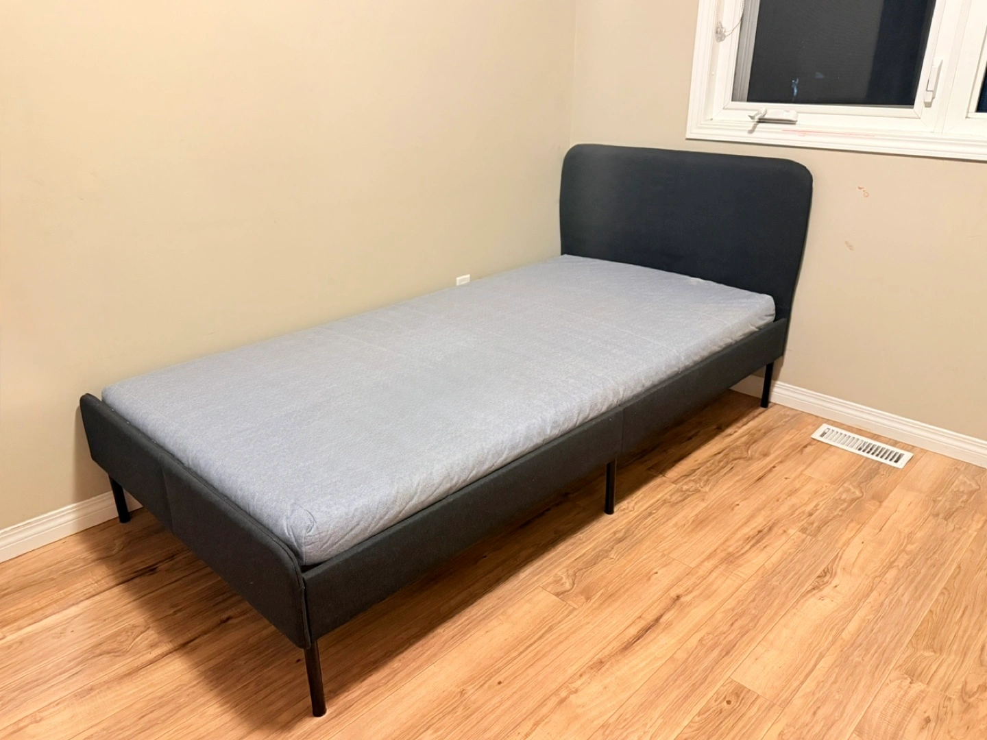 Selling a twin size IKEA Slattum upholstered bed frame in Vissle dark gray, along with an Ågotnes foam mattress in firm/light blue. Both are in great condition and ready for a new home! Originally, the bed frame was $129 and the mattress was $99. Selling @ 120 frame & mattress