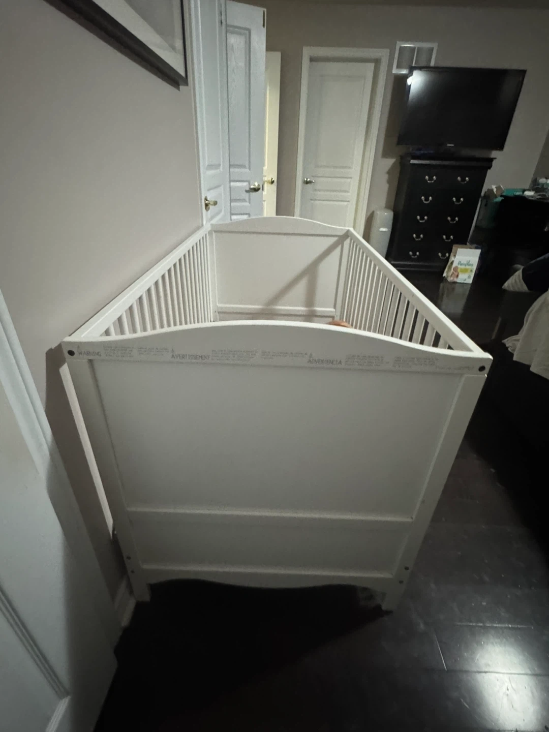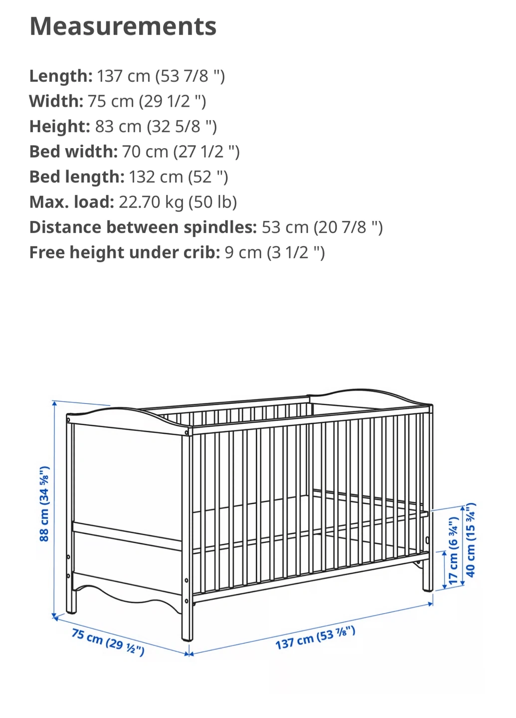 Selling an IKEA SMÅGÖRA crib in solid beech. It's in great shape and ready for a new home! The crib measures 137 cm in length, 75 cm in width, and 83 cm in height. It has a max load of 22.70 kg (50 lb). The bed width is 70 cm. Its white. Excellent condition as it was barely used.