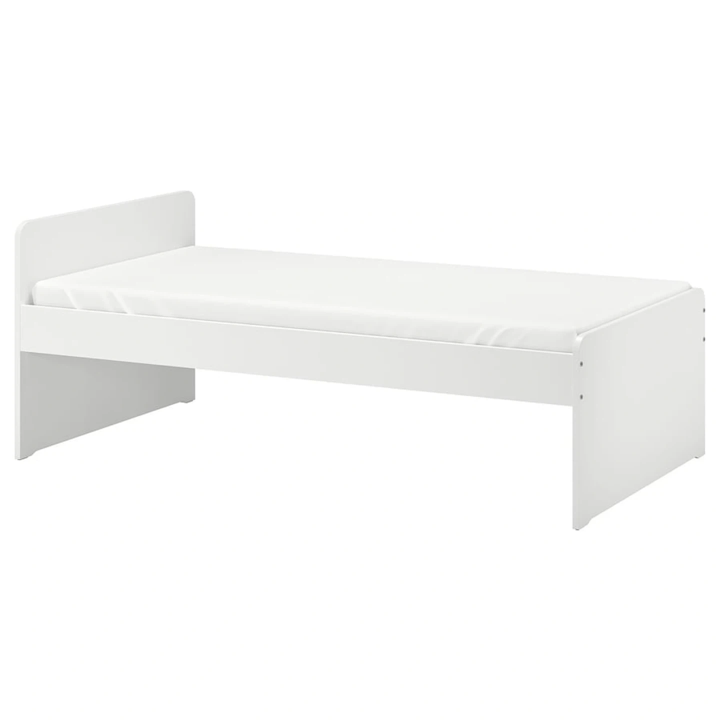 Selling a white IKEA SNIGLAR bed frame! It's in great shape and ready for a new home. The dimensions are approximately 196 cm (77 1/8") in length, 103 cm (40 1/2") in width, and the headboard is 78 cm (30 3/4") tall. Perfect for a kid's room or a guest room, two beds