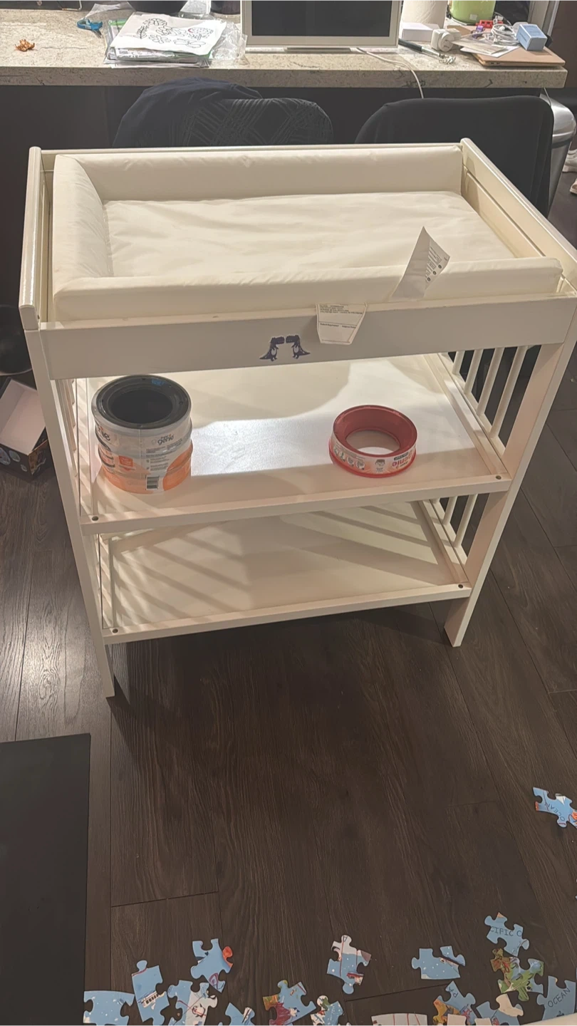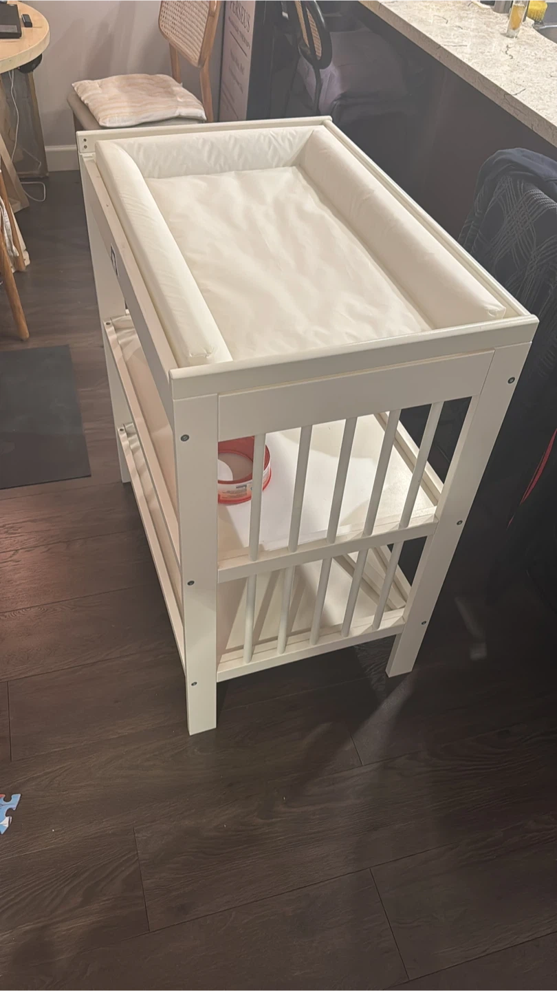 Selling a gently used IKEA SNIGLAR changing table! It's in great condition and ready for a new home. Perfect for keeping baby essentials organized and within easy reach. This changing table is a practical and stylish addition to any nursery Will include 4 rolls of diaper genie bags.