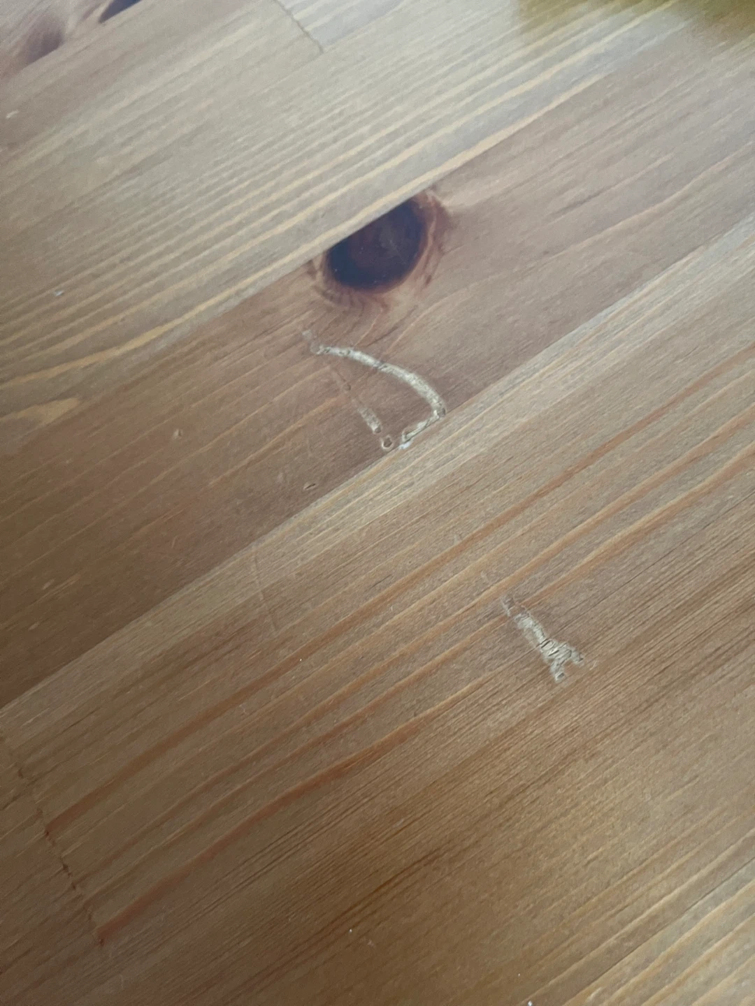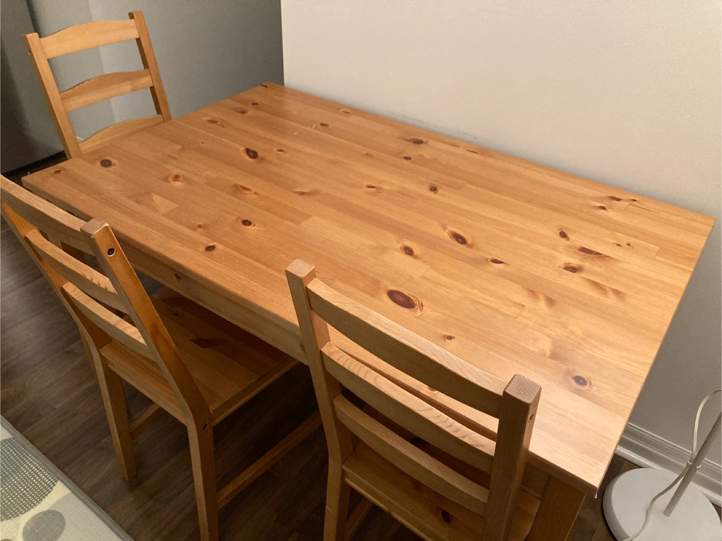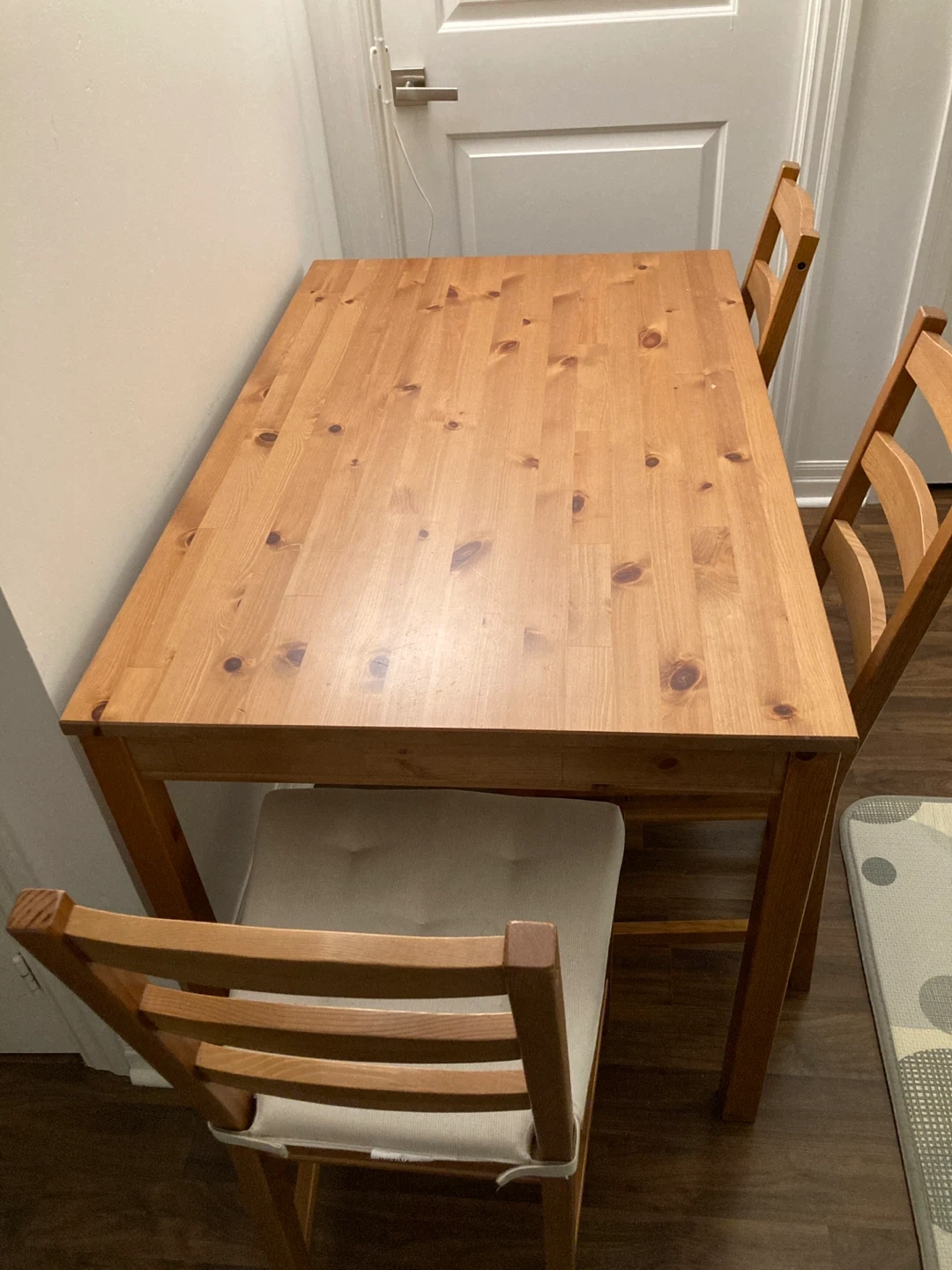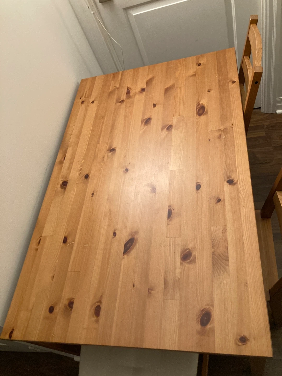 It’s been well used, with visible wear and some scratches. The legs squeak a bit, and the table legs can’t be detached (they were tightened too much before, and I don’t have the tools now). You’ll need a large vehicle for pickup.