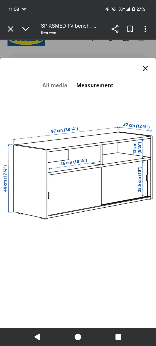 Selling an IKEA SPIKSMED TV bench in white. It’s in great shape and ready for a new home! This stylish TV bench offers a sleek design with ample storage space, perfect for organizing your entertainment area. The dimensions are 97 cm (38 ¼") wide, 44 cm (17 ¼") high, and 32 cm (12 ½") deep.