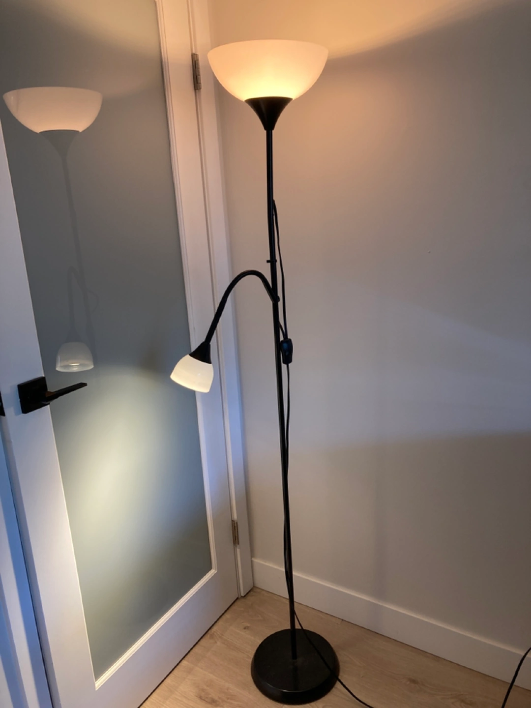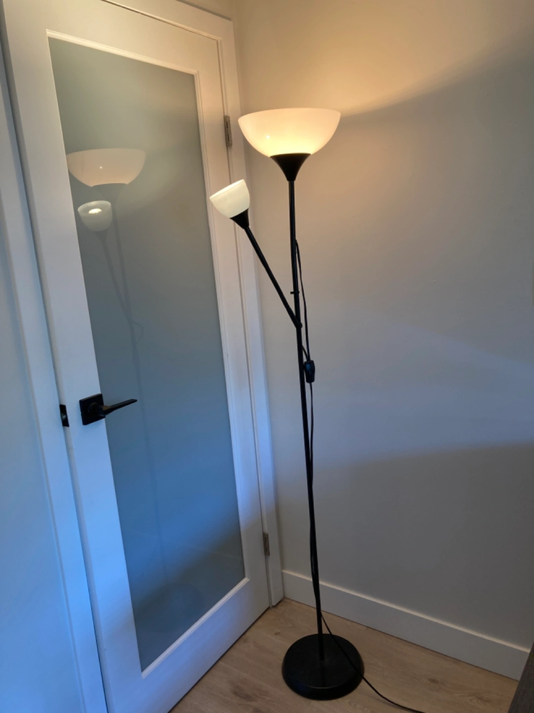 Ikea standing lamp, black with frosted white plastic shade. Large portion of lamp is stationary, but the smaller arm is adjustable (good to angle down for reading or drawing). Two separate switches. Pickup near or at lougheed mall