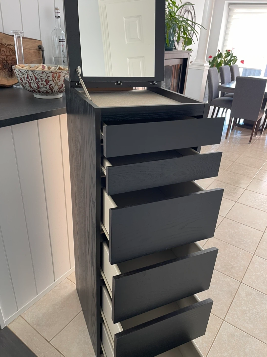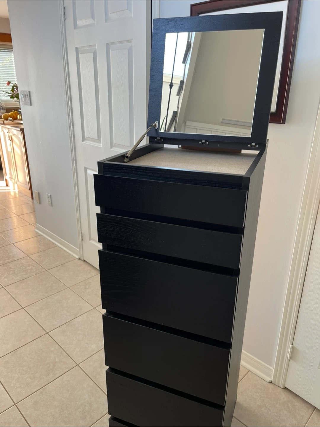 Tall dresser with a sleek black finish and multiple drawers, perfect for maximizing storage space. It also features a flip-up mirror, making it ideal for use as a vanity or for getting ready in the morning. This dresser is in great condition and ready to find a new home!