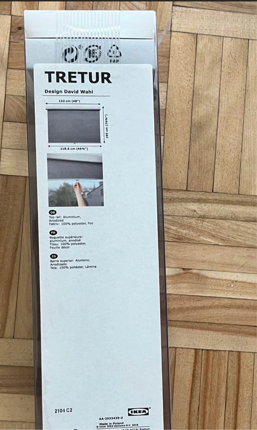 Selling an IKEA Tretur roller blind New! It's 122 cm (48 inches) wide and 195 cm (76 inches) long. The top rail is made of aluminum, and the fabric is 100% polyester. Comes with the original box!