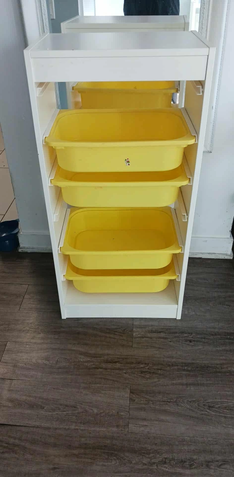 Selling an IKEA Trofast frame in white with yellow bins. It's a great storage solution for kids' toys or other items. The frame is in good condition and comes with the yellow bins as shown in the picture