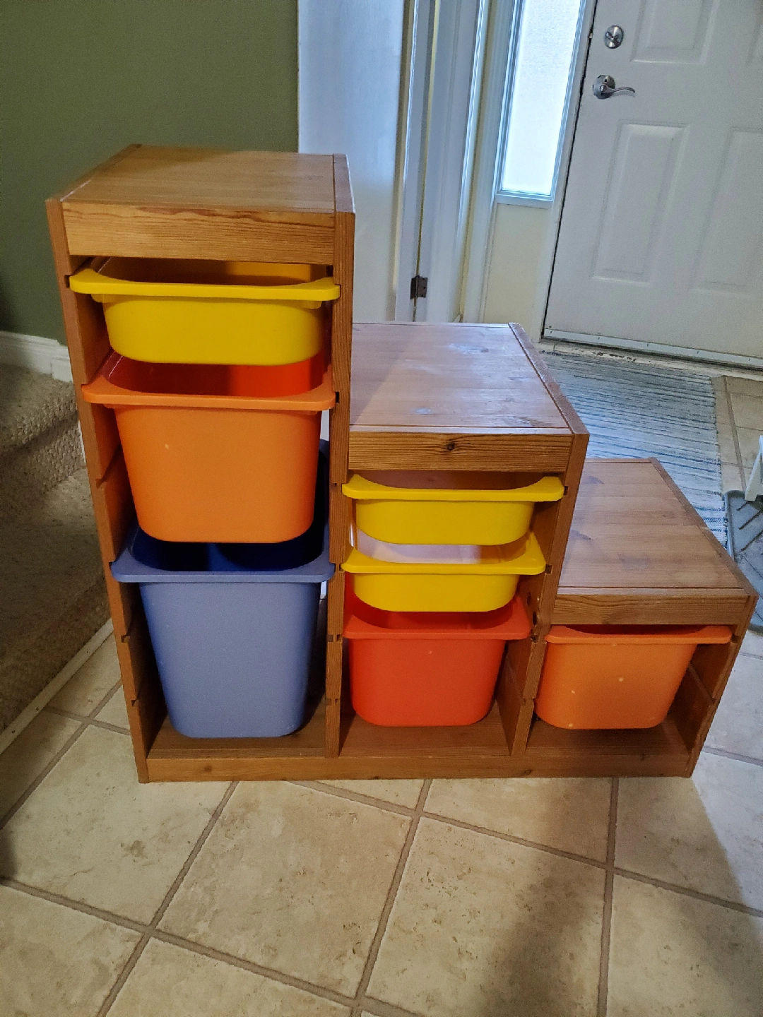 Selling an IKEA TROFAST storage combination with bins! This is perfect for organizing toys, crafts, or anything else you need to keep tidy. The frame is made of sturdy wood, and the bins come in a mix of colours like yellow, orange and blue. It's in great condition and ready for a new home! SMOKE FREE